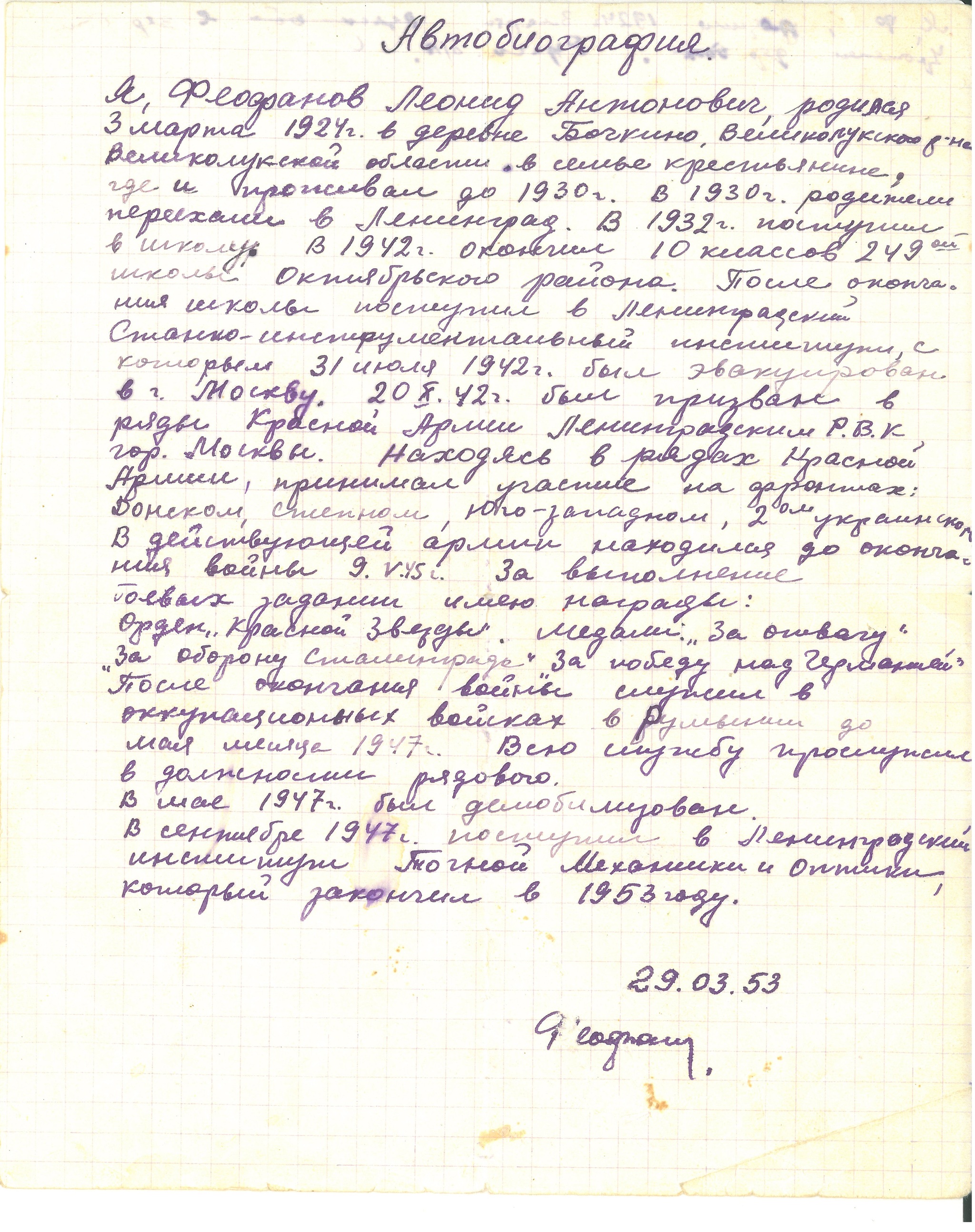 После дембеля батя не расслабился, а - поступил в институт. В тот самый ЛИТМО, куда в 1942 уже поступал. Это, конечно, сильно. Мало того что поступил (приняли фронтовика фактически без экзаменов), так еще и не вылетел, выучился. Закончил в 1953. Выпускник!