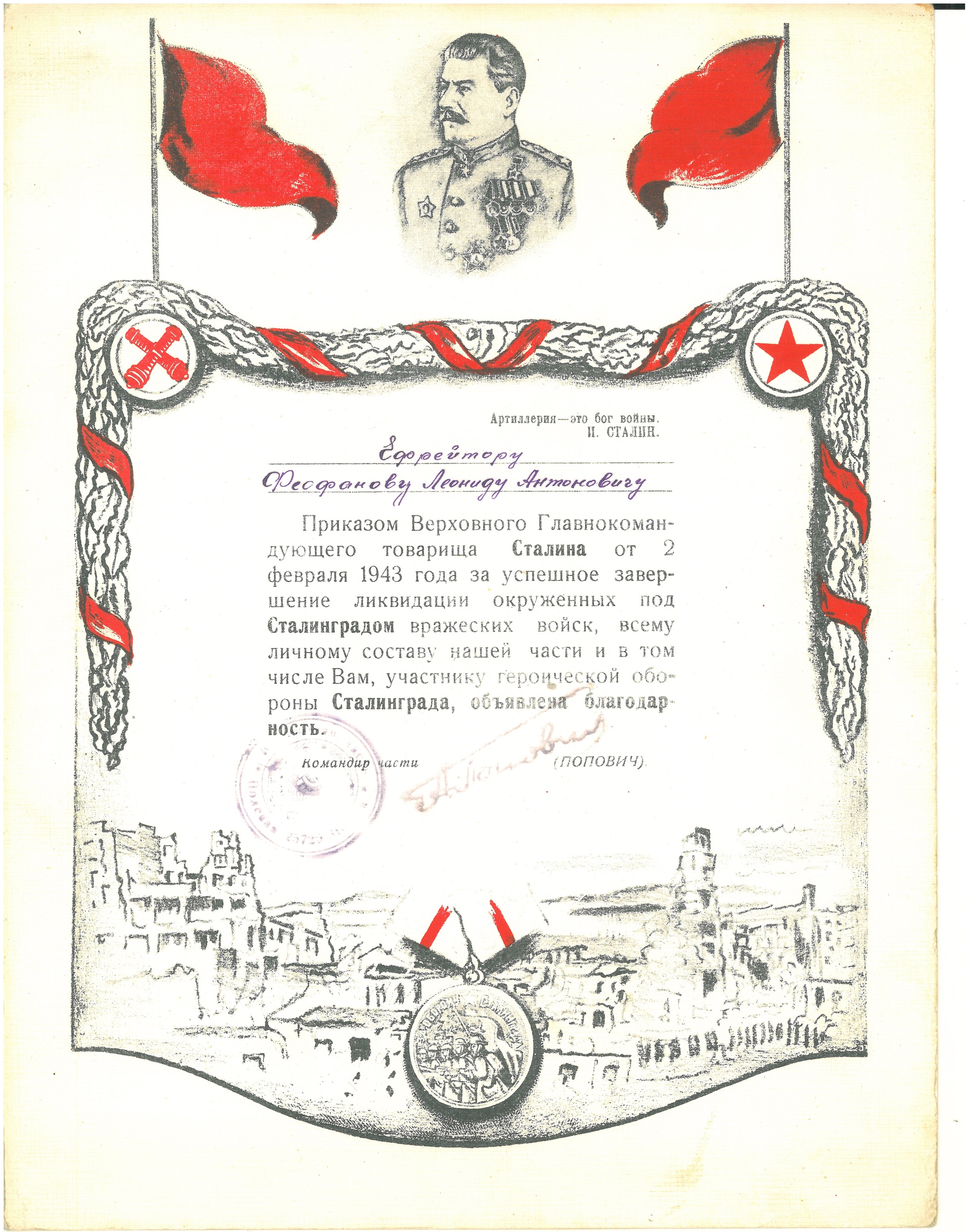 Отцу очень повезло, что попал он под Сталинград ровнехонько перед началом нашего наступления (может быть, как раз поэтому и попал), но первые несколько недель для выживания были критичными. Линия фронта немного "дышала", было несколько столкновений с немецкой пехотой со стрельбой, были обрывы линии связи которые искать и чинить посылали почему-то в том числе и батю. Горячая пища была примерно через день (кухня не приезжала, но мужики притаскивали термос с еще теплой кашей). Тащили его ползком под риском быть обстрелянными с немецкой стороны.