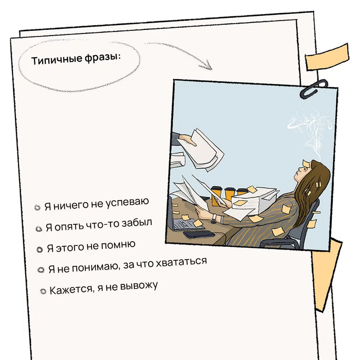 У руководителя это может также проявляться в имитации бурной деятельности, микроменеджменте и совещаниях ради совещаний. Потому что энергии на более важные и серьёзные задачи нет, а делать что-то нужно.