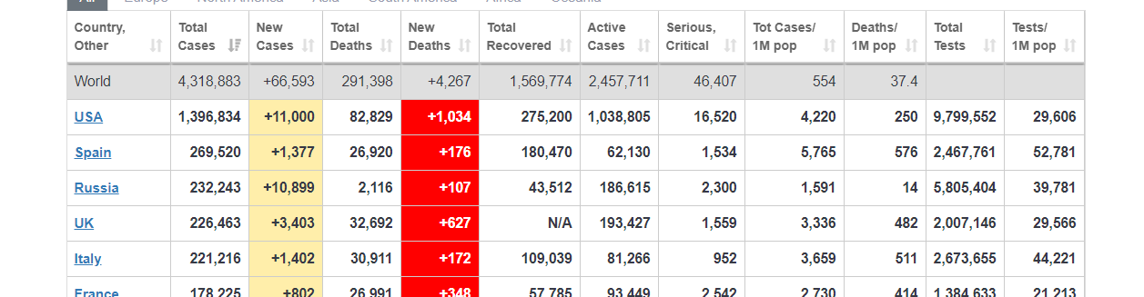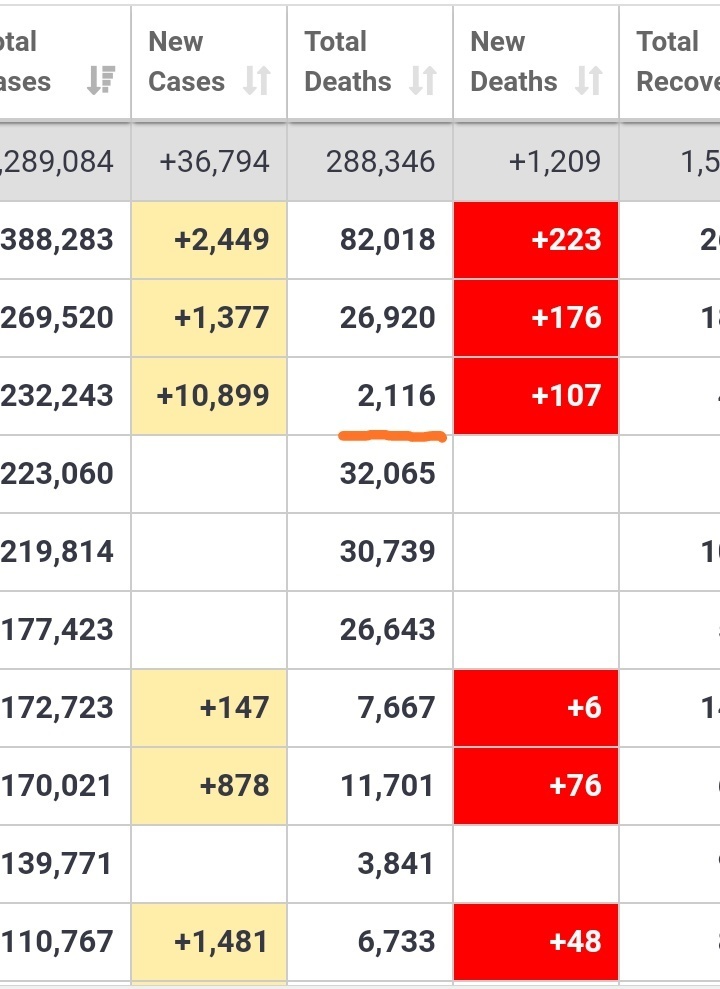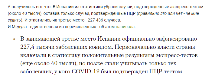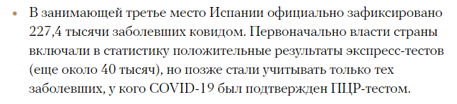 А получилось вот что. В Испании из статистики убрали случаи, подтвержденные экспресс-тестом (около 40 тысяч), оставив только случаи, подтвержденные ПЦР (правильно это или нет - не мне судить). И откатились на третье место - 227 436 случаев.