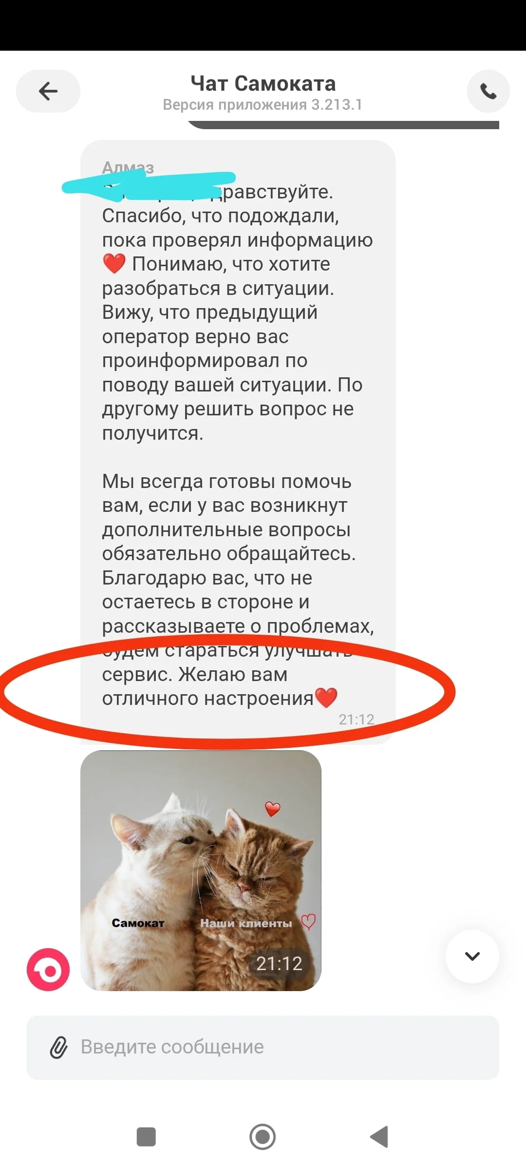 Далее Милена сдалась, закрыла чат, а в разговор вступил дружелюбный, но ни в коей мере более полезный в решении проблемы Алмаз ,который пошел с козырей...мяу...