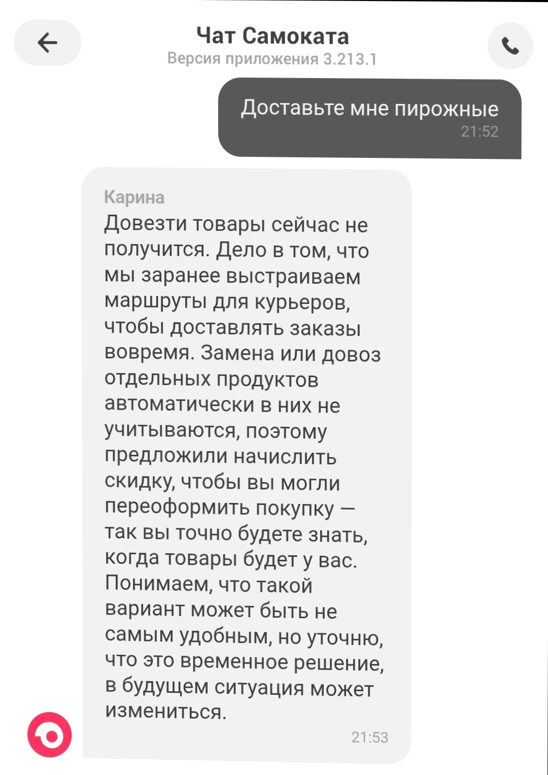 возврат денежных средств нам даже не предложили, хотя по закону при оплате товара и его дальнейшем отсутствии на вручение покупателю, он вправе требовать возврат денежных средств, а повторную доставку товара по заказу самокат не смог обеспечить, кинули скрипт о маршрутах курьеров;