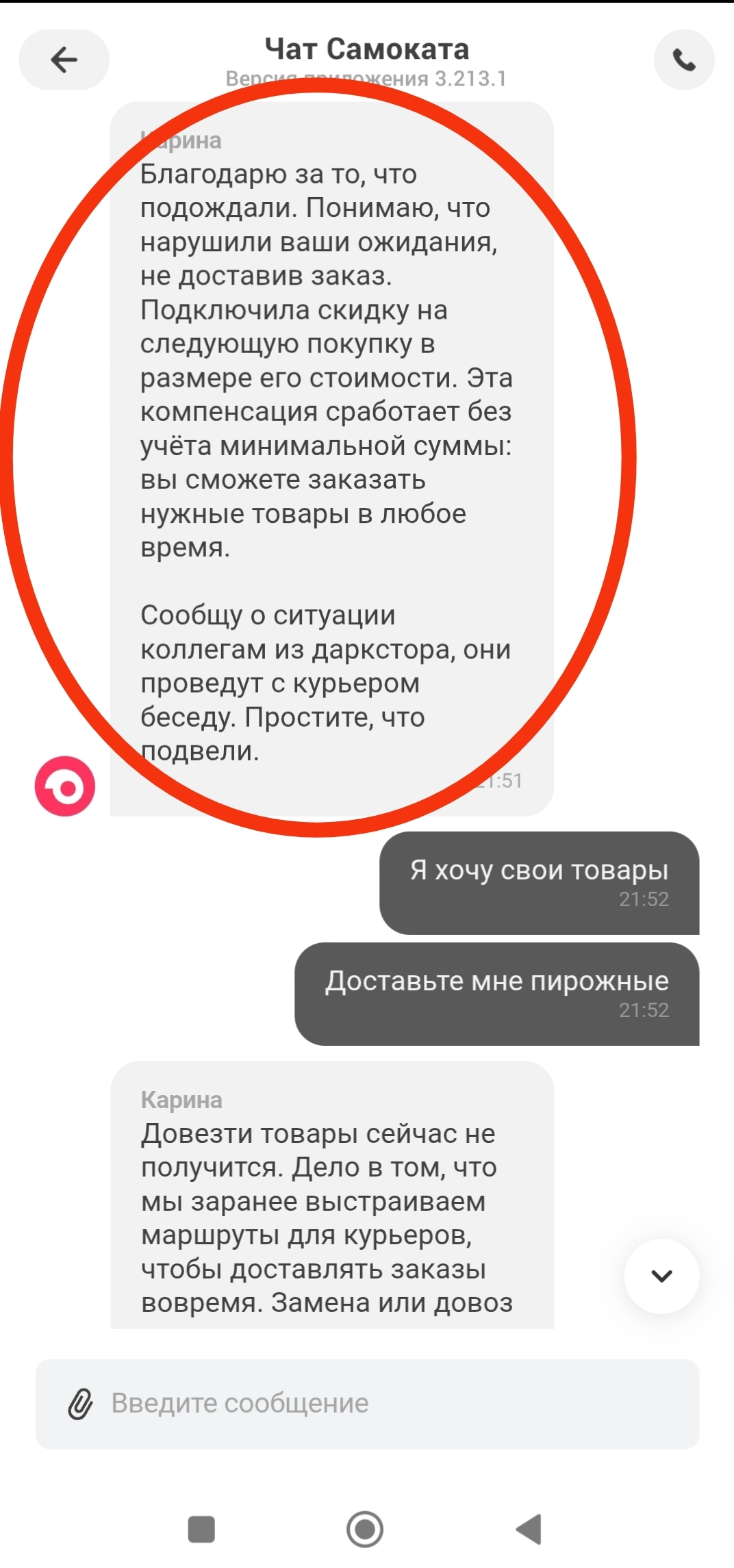 В 19 20 сделали заказ из 3 булочек к чаю на сумму около 700 рублей, в 19 50 заказ доставили (спойлер не нам), в 20 00 обращаемся в поддержку, с 20 до 22 рвем ж...,пытаемся доказать свои права, чтобы нам вернули деньги или наконец-то доставили товар, и неожиданный для нас финал ....или начало новой истории ;)