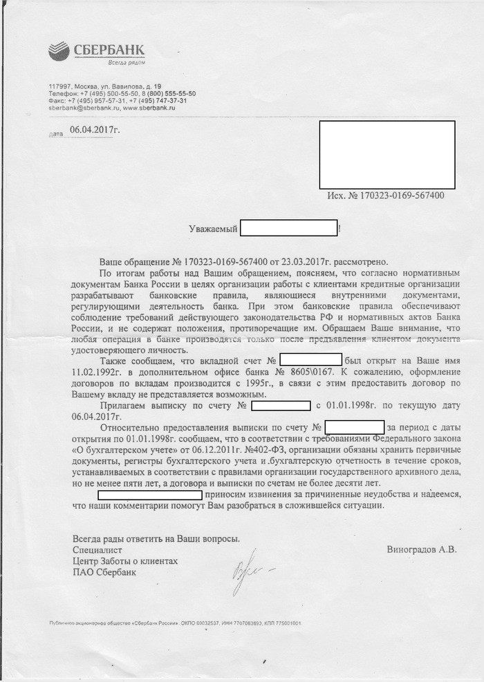 В связи с какими именно технологическими особенностями они решили меня в известность не ставить, что происходило со счетом в этот период не известно. Но из письма предельно ясно, что в 1992 году ребенок 9 лет свободно мог открыть у них счет. Что же, интересно что спустя три месяца они смогли найти карточку лицевого счета, в которой указано фамилия вносителя. Но за чем в неё то смотреть и писать, что на ваше имя данный человек открыл счет, НЕТ, вы пришли и открыли.