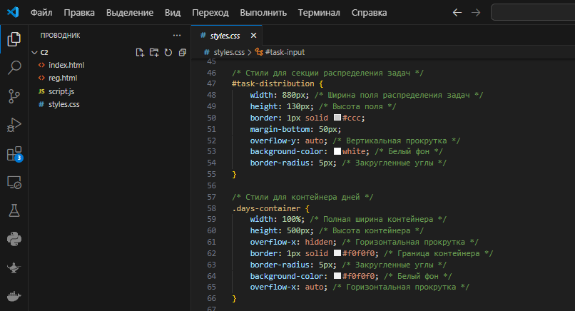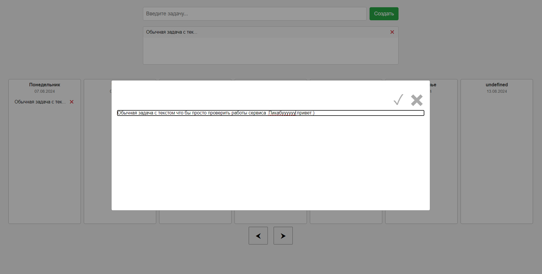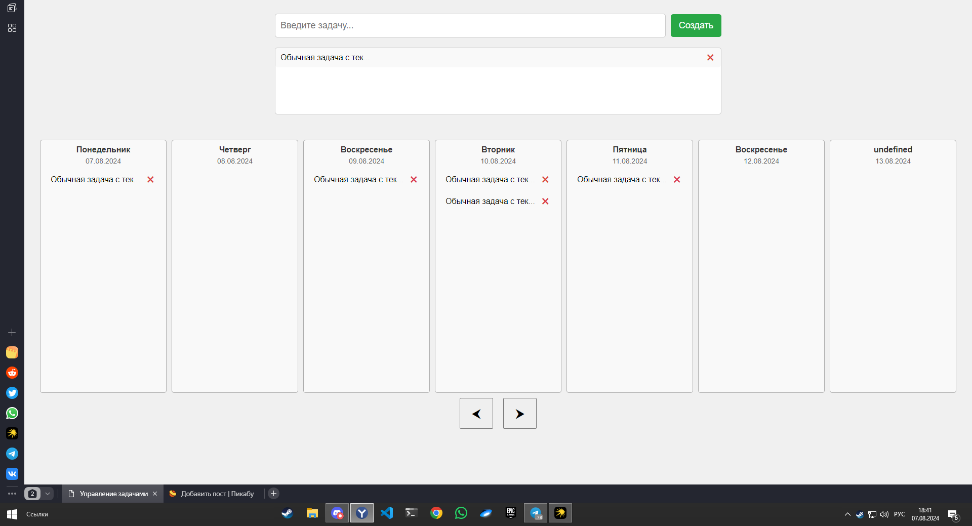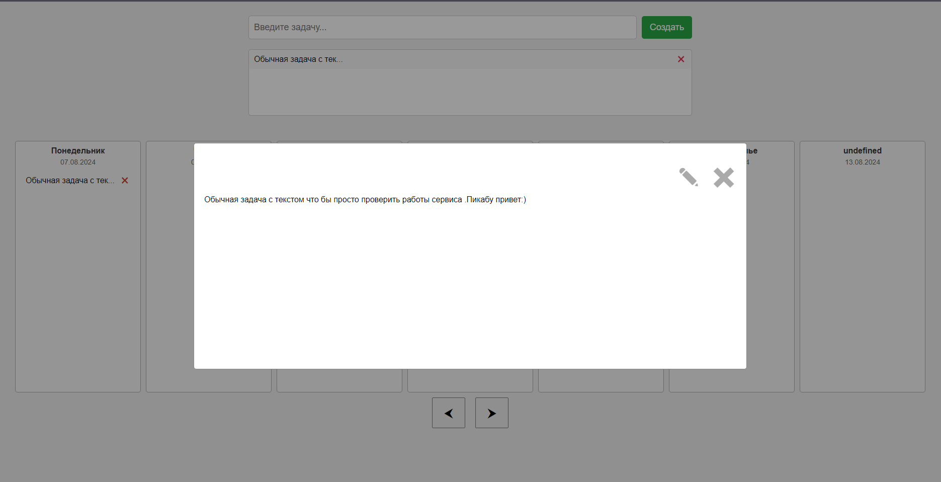 Основная страница имеет три поля :1 поле ввода задачи через кнопку создать или enter /2 поле распределения задач путем перенесения задачи в нужный день или обратно (максимальное количество задач в этом поле может храниться это 30 шт) + кнопка удаления задачи .3 поле самое сладкое и самое противное в создании тк несет +100500 проблем и 90% работы с ним .Тут просто вертикальные поля дней куда можно поместить до 50 задач ,либо перетащить в другой день ,просмотреть задачу более подробно (скрин 2) или удалить ее .Важно все задача по окончанию дня в 00:01 переносятся с прошлого дня на наступивший (для меня это лично удобно)Так же забыл упомянуть простое ориентирование по днем недели(которые сцука сломаны сейчас) и даты