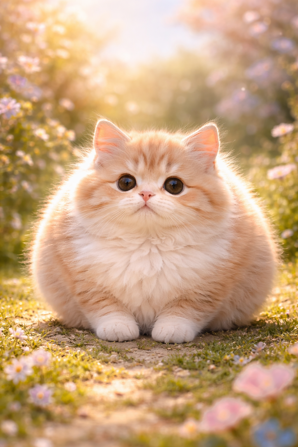Cute fluffy kitten sitting in a magical flower garden, dreamy atmosphere, pastel colors, vertical wallpaper, 9:16 aspect ratio, high resolution, soft bokeh