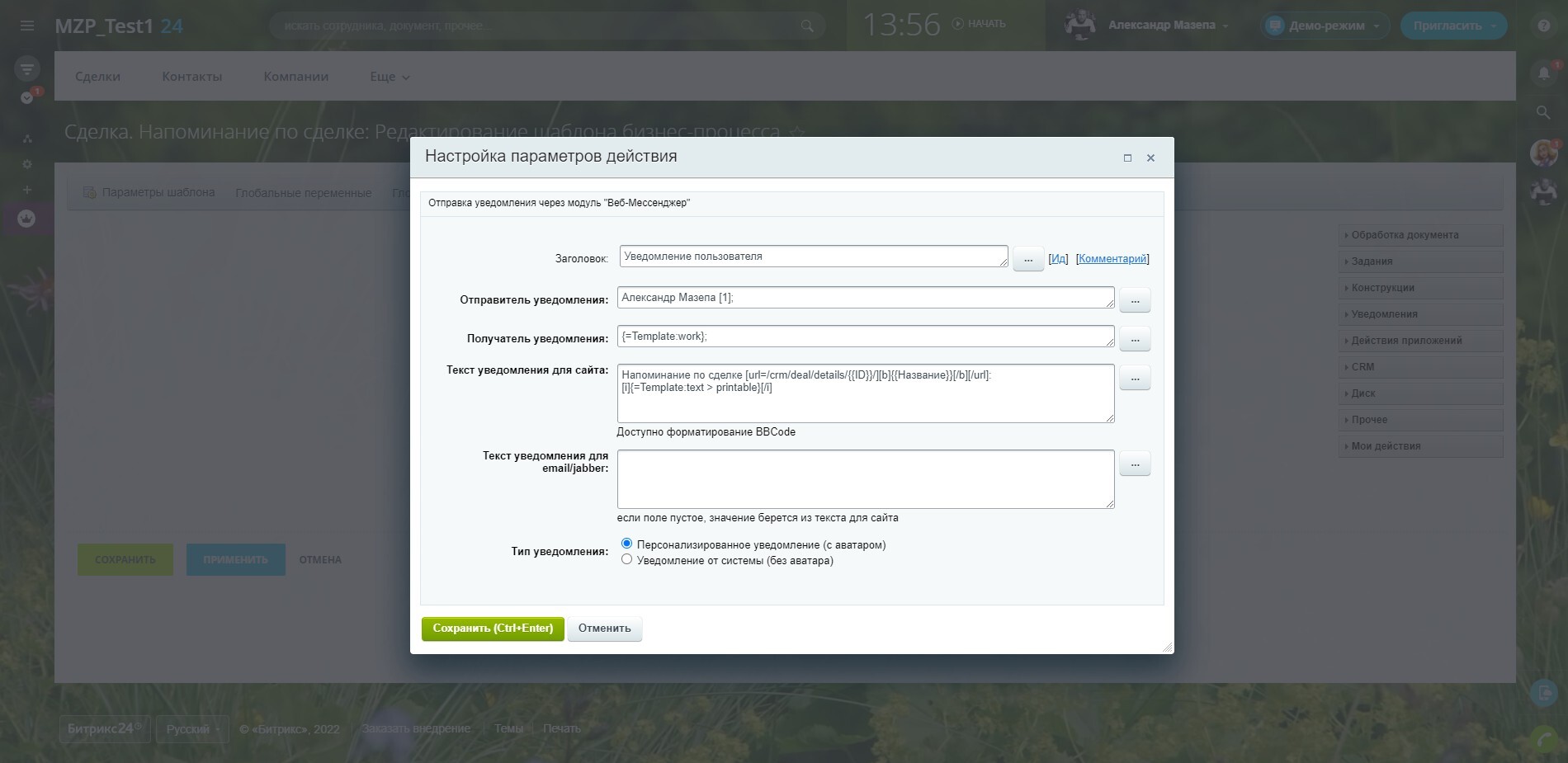 3. Следующее действие — Уведомление пользователя. Необходимо указать текст уведомления, сотрудника и ссылку на сделку. Данные берем из параметров, а для формирования ссылки используем код [url][/url] (см. скриншот ↓)