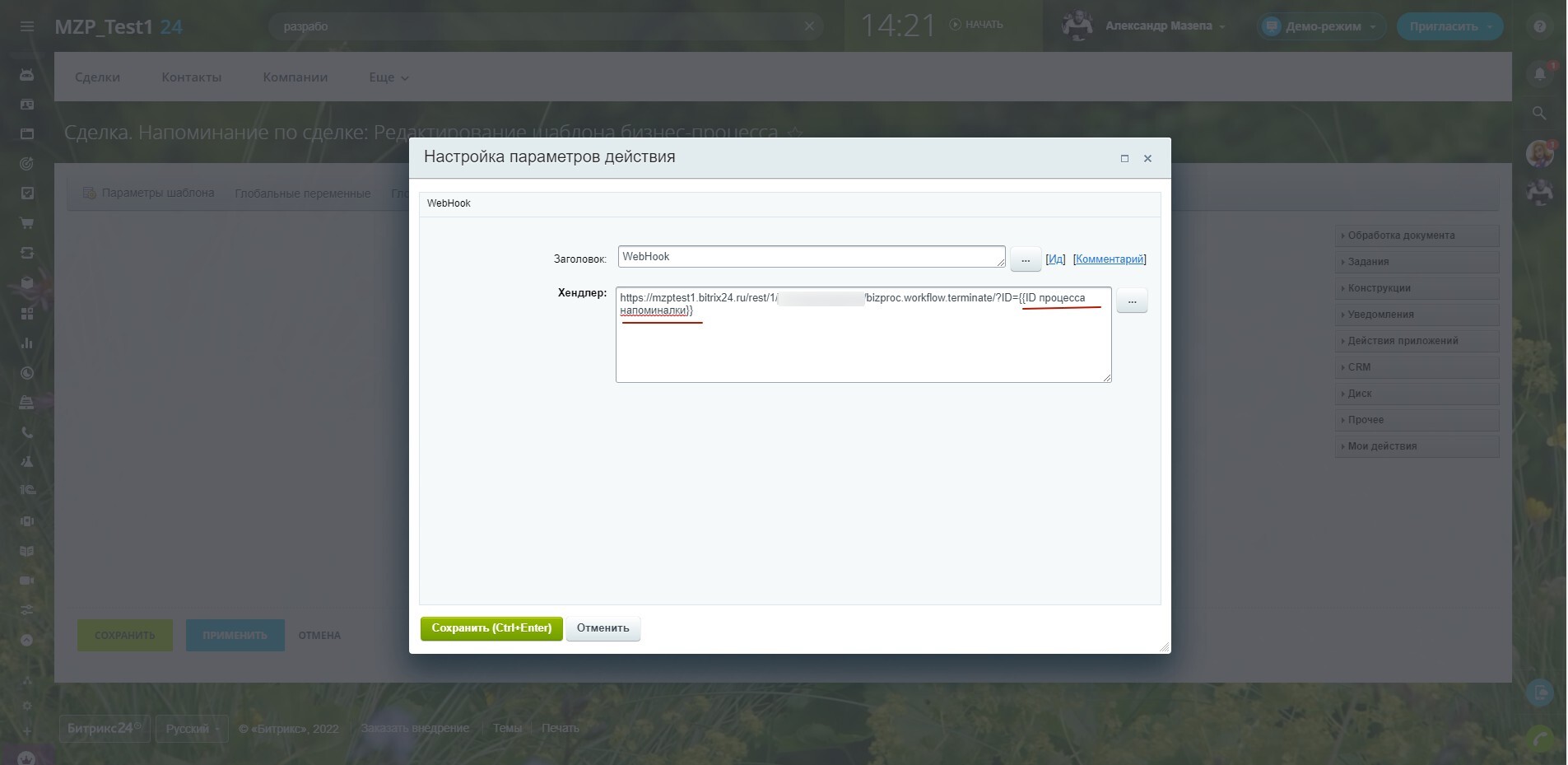 Далее возвращаемся в наш процесс для напоминалки и добавляем действие. В параметрах веб-хука укажем значение нашего служебного поля.