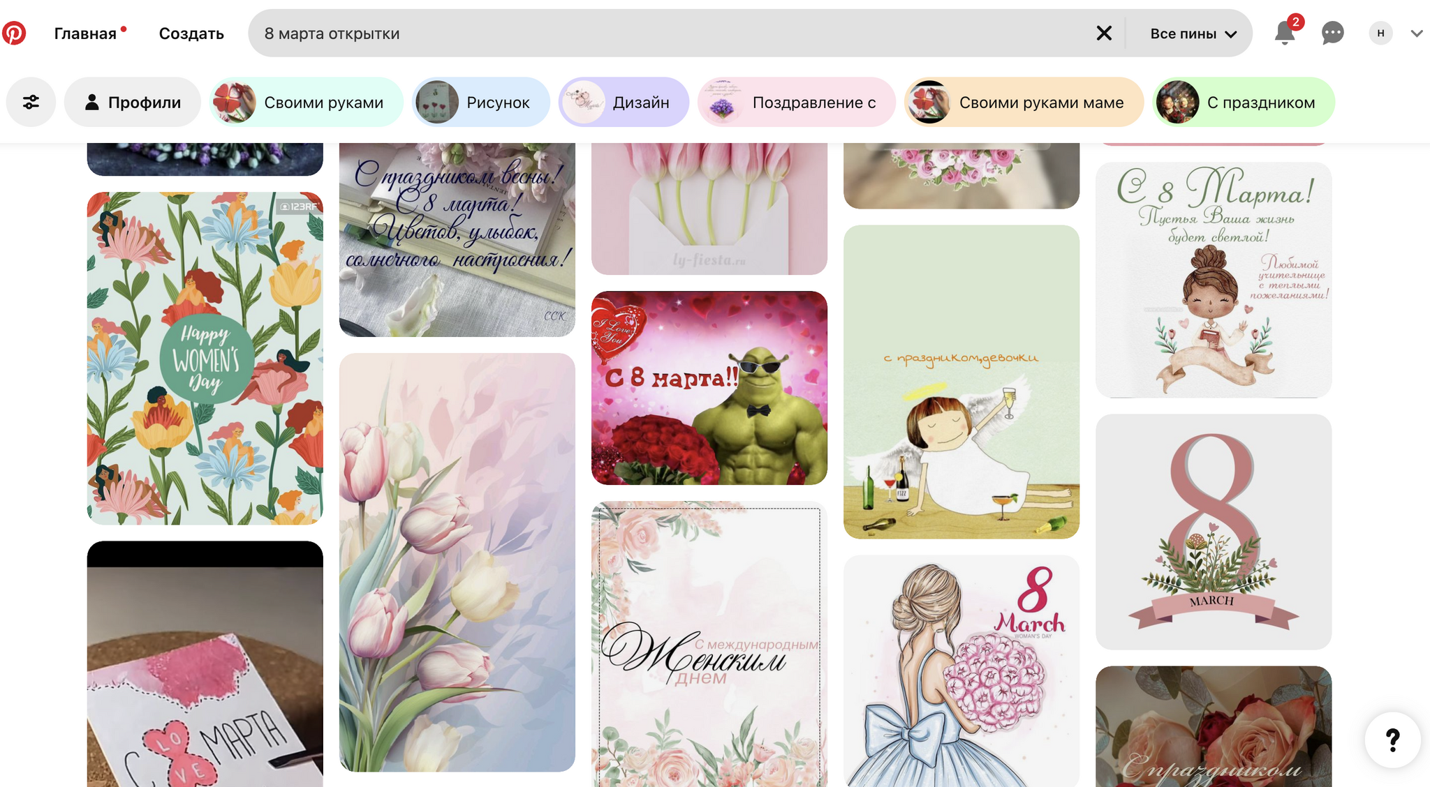 Я люблю начинать с вдохновения, когда его нет, я его черпаю либо в Google картинках, либо в Pinterest - там результаты чаще интереснее. В данном случае, я просто зашла на сайт и ввела "8 марта открытки" - ничего сложного.