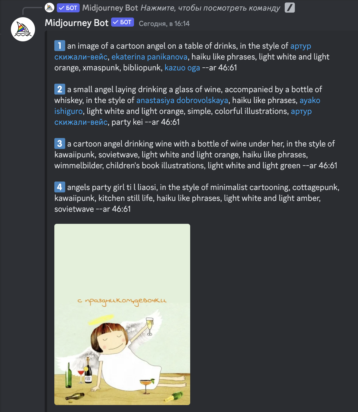 Осталось только скопировать получившиеся промпты, вставить в Midjourney и получить изображения. Кстати, можно еще подключить --sref. (этим тонкостям обучаю)Понравившиеся апскейлить через кнопки U. Не исключено, что изображения будут с непонятным текстом, как у меня, особенно, если на открытке - исходнике был текст: