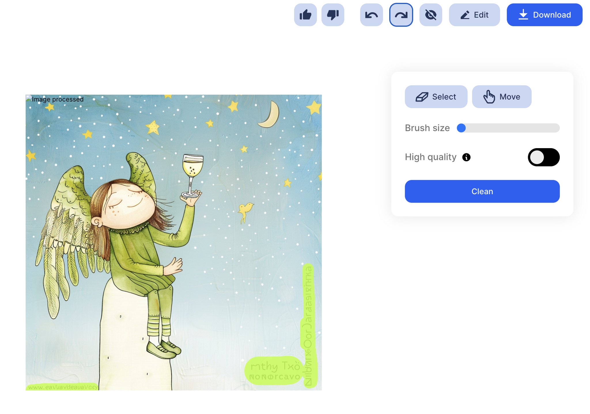 Если мы решили пойти другим путем, и написать текст на русском языке, нам необходимо удалить непонятный текст на изображении. Для этого я использую сервис Clipdrop - там инструмент Сleanup, либо сервис Cleanup.pictures - они как раз нужны для удаления нежелательных объектов. Ничего сложного - загружаю изображение, выделяю нежелательный текст и нажимаю кнопку «Clean»:
