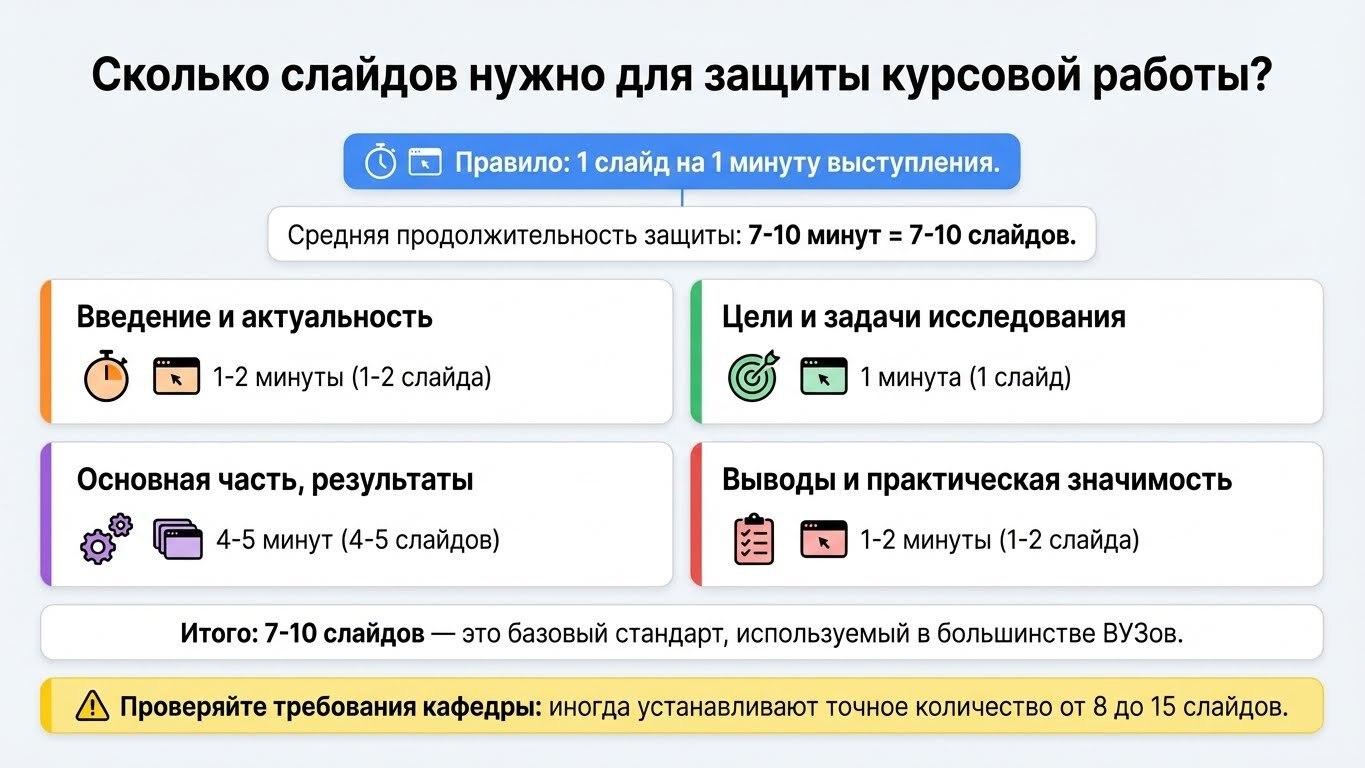 Оптимальное количество — 15-20 слайдов для бакалавриата, 18-25 для магистратуры. Ориентируйтесь на время доклада: 7 минут = 14-15 слайдов, 10 минут = 20-22 слайда. Учитывайте, что на сложные слайды с графиками нужно больше времени.