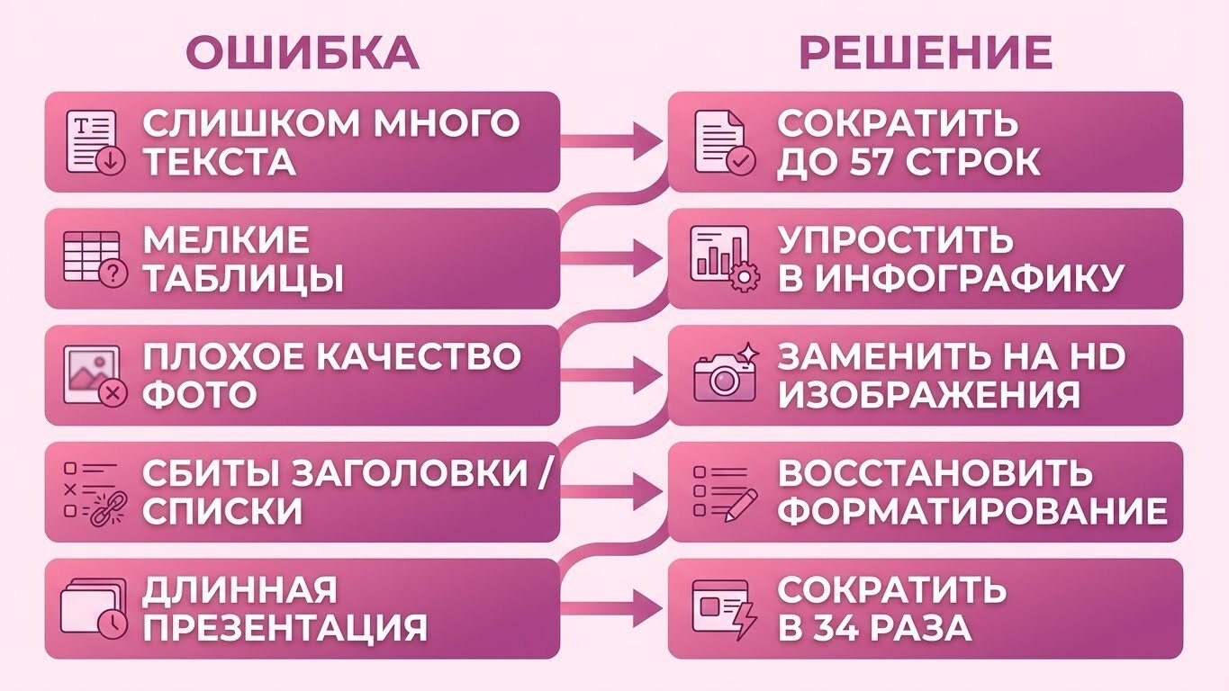 Студенты часто копируют целые абзацы из диплома на слайды. Результат — нечитаемая «простыня» мелкого текста. Помните: презентация дополняет устный доклад, не дублирует его.