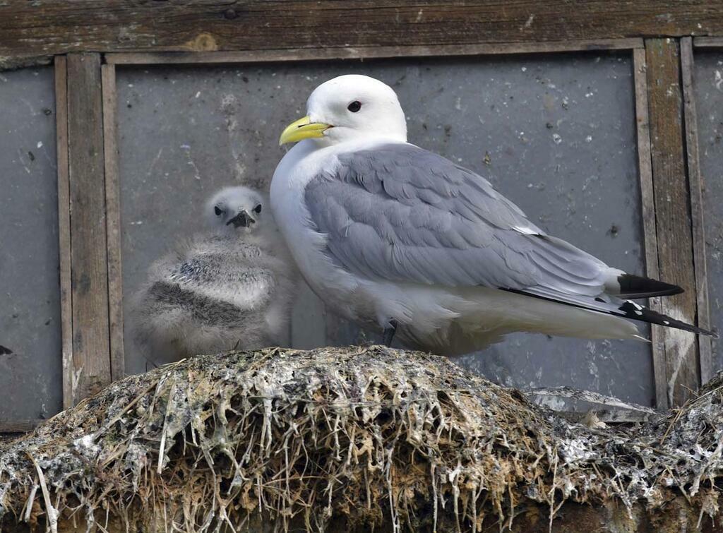 В конце мая - начале июня у чаек появляются птенцы, обычно от одного до трех. Весьма занимательно наблюдать за тем, как они взрослеют. А растут чаёныши очень быстро. Родители только успевают летать за кормом. И вот смотришь, уже по всей крыше бегают, пытаются крылья размять, взлететь на несколько сантиметров вверх.