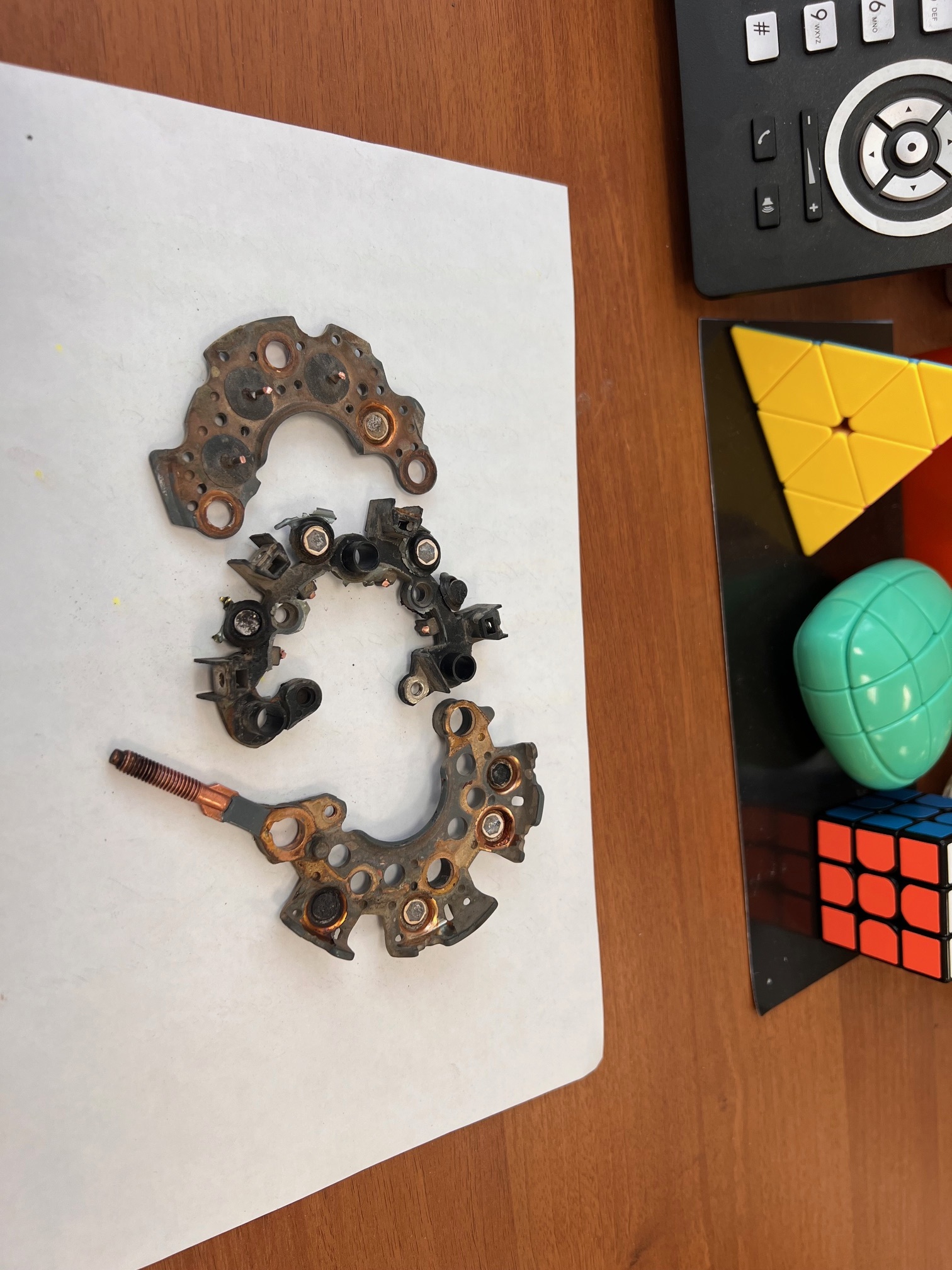 Это мы с коллегой разобрали диодный мост на работе. Хорошо видно причину в двух крайних диодах. Три по центру живы.