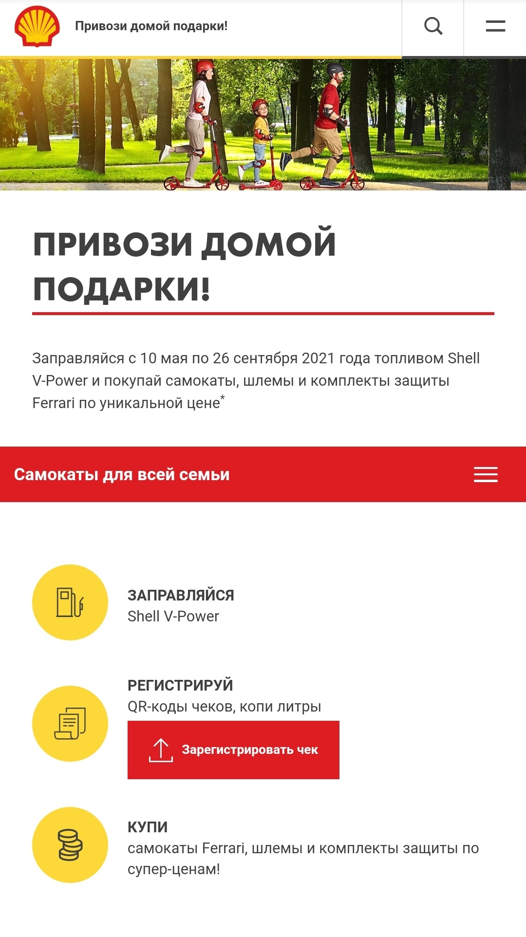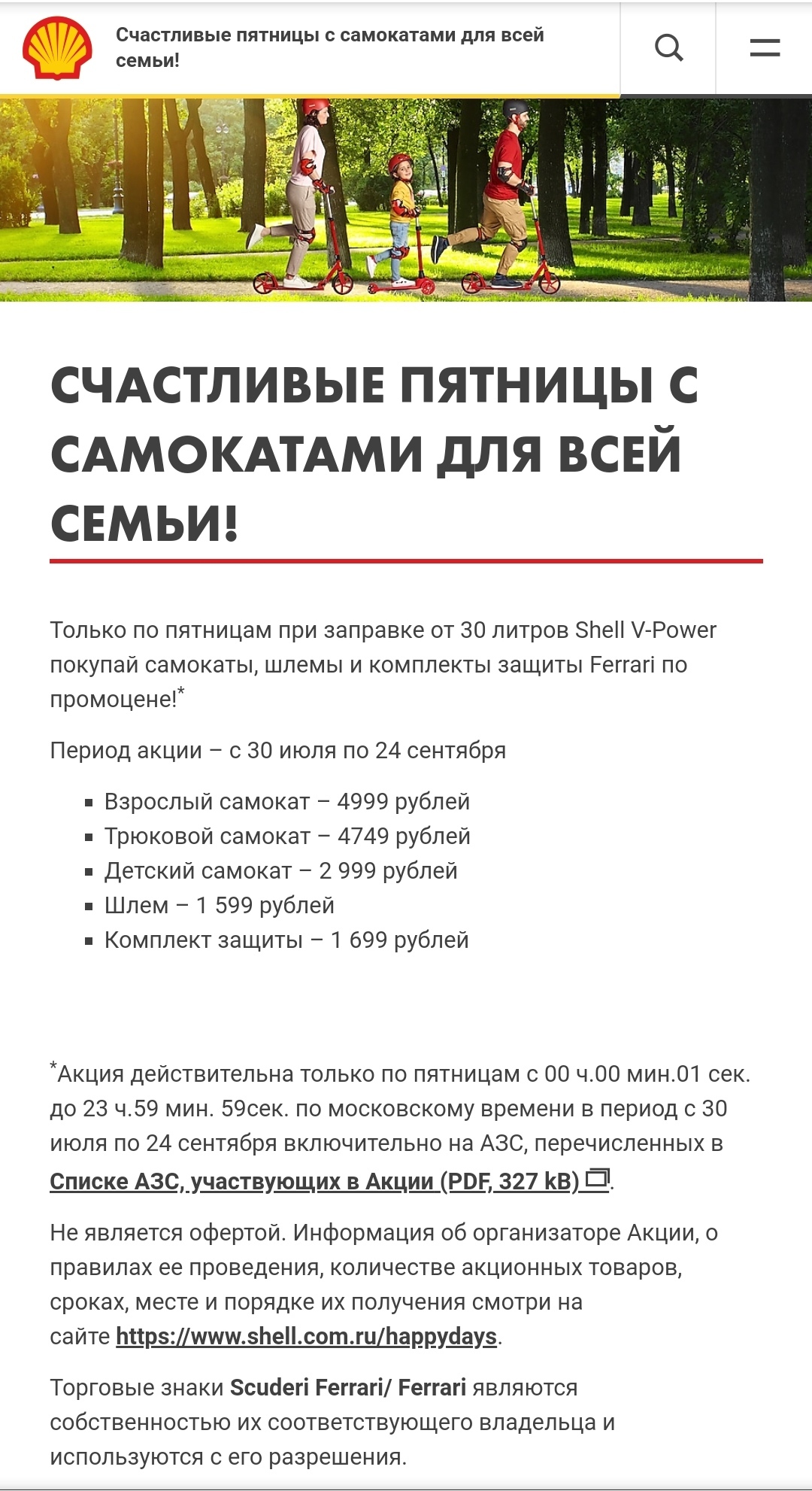 Только по пятницам при заправке от 30 литров Shell V-Power покупай самокаты, шлемы и комплекты защиты Ferrari по промоцене!*Отличное предложение, надо всего 30 литров заправить.