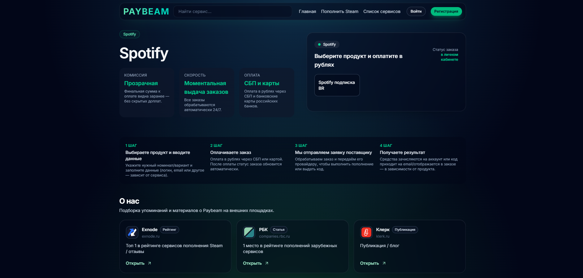 Paybeam — универсальный онлайн-сервис для оплаты цифровых подписок и сервисов, ориентированный на быстрые зачисления. Пользователь самостоятельно выбирает услугу, указывает сумму и оплачивает заказ через защищенные платежные шлюзы. Paybeam часто выбирают за понятный интерфейс, отсутствие сложных процедур и возможность быстро получить доступ к Spotify без передачи данных аккаунта.
