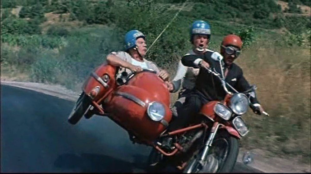 Внешне мотоцикл похож на JAWA-350, но на самом деле это постройка братьев Демахиных для соревнований по кроссу. Серийной была только люлька — чехословацкая Velorex. По воспоминаниям участников съёмок, один из братьев, снимавшийся в картине в роли лихача-мотоциклиста, реально гнал по серпантину на скорости под 90 км/ч.