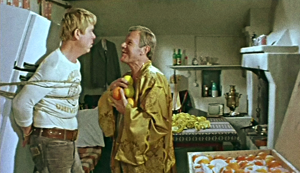 11. Помните сцену, когда Степана (Михаил Кокшенов) привязывают к холодильнику и заставляют есть гору апельсинов? Ну, почти гору. Михаил Пуговкин, исполнивший роль Сан Саныча, рассказал, что на самом деле тогда на съёмочной площадке было всего два настоящих апельсина, а все остальные – бутафорские. Пришлось выкручиваться и растягивать их на всю сцену.