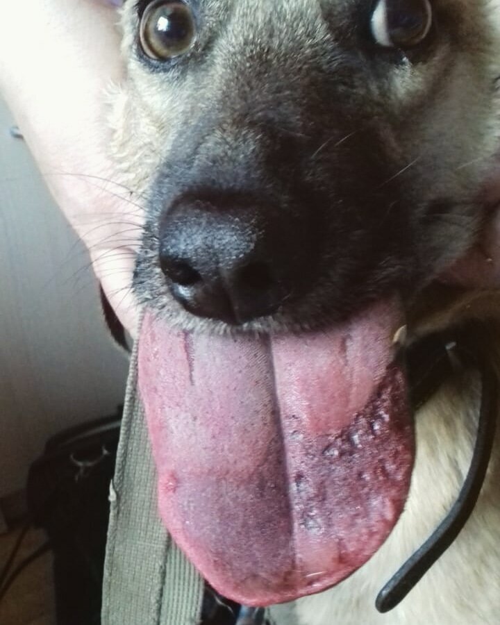 Приезжаю как-то на вызов и вижу такую картину. Со слов хозяйки уже двое суток, по рекомендациям какой-то дистанционной ветеринарши, собаку пытаются лечить от аллергии. А язык все больше и больше, в пасть не помещается, плюс собака его уже сильно поранила.