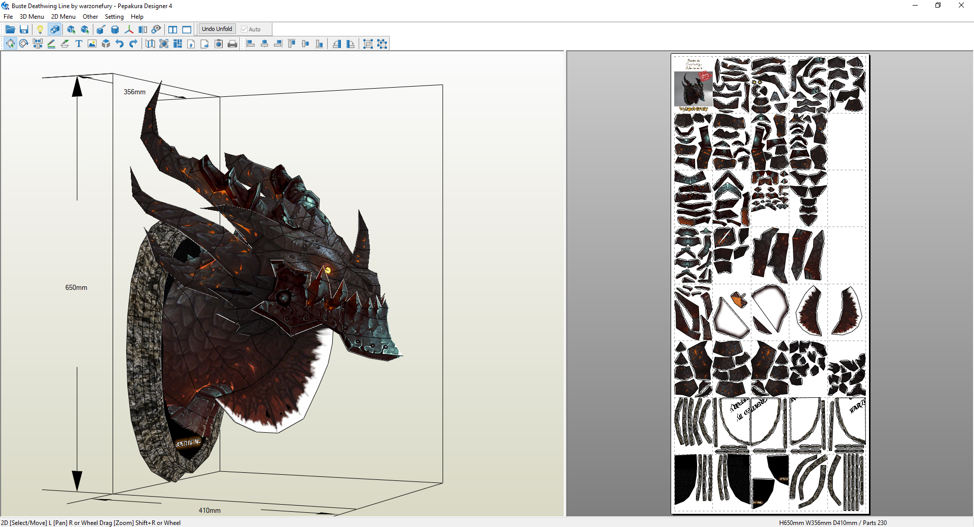 Pepakura, если очень кратко объяснять, программа для "разворачивания" 3D-моделей и их преобразования в раскройку из деталей пригодную для сборки в 3D-модель, у себя на столе под сериальчик. Программа разбивает детали по листам А4, правда не всегда правильно и ровно. Вывод на принтер возможен прямо из программы. Детали вырезаются, сгибаются где нужно, склеиваются и по сути всё!