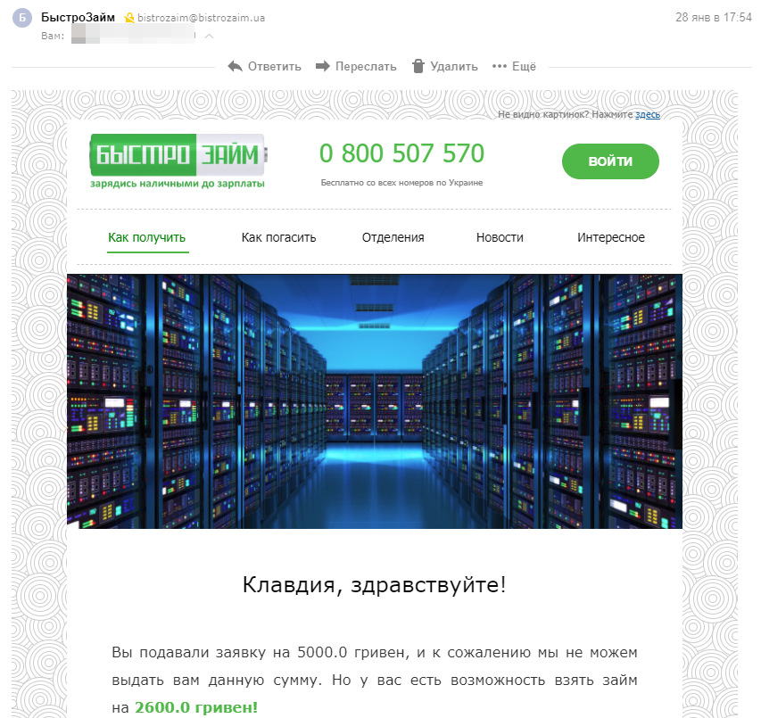 Компания БыстроЗайм присылает мне новую серию писем. Видимо уж очень нужны деньги человеку.