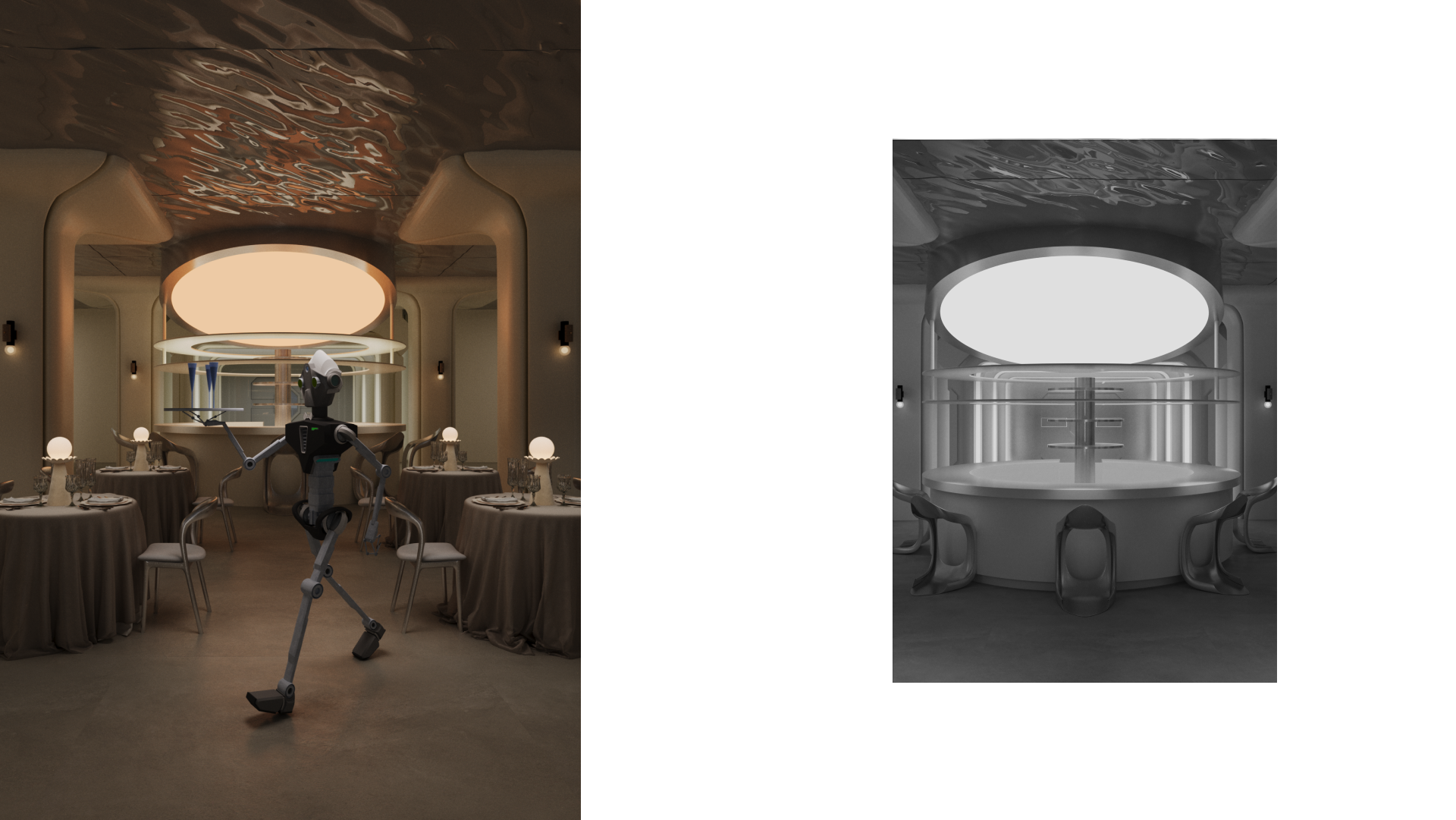 • Ресторан - Является завершающим пространством в отеле. Он продолжает тему океана и его загадок. Это не просто место для трапезы, а пространство для медитации и осознания, где каждый гость может задуматься о величии океана. Здесь «Мыслящий океан», омывающий Солярис, уподобляется гигантскому мозгу, воплощению всеведения, которое отказывается от общения.