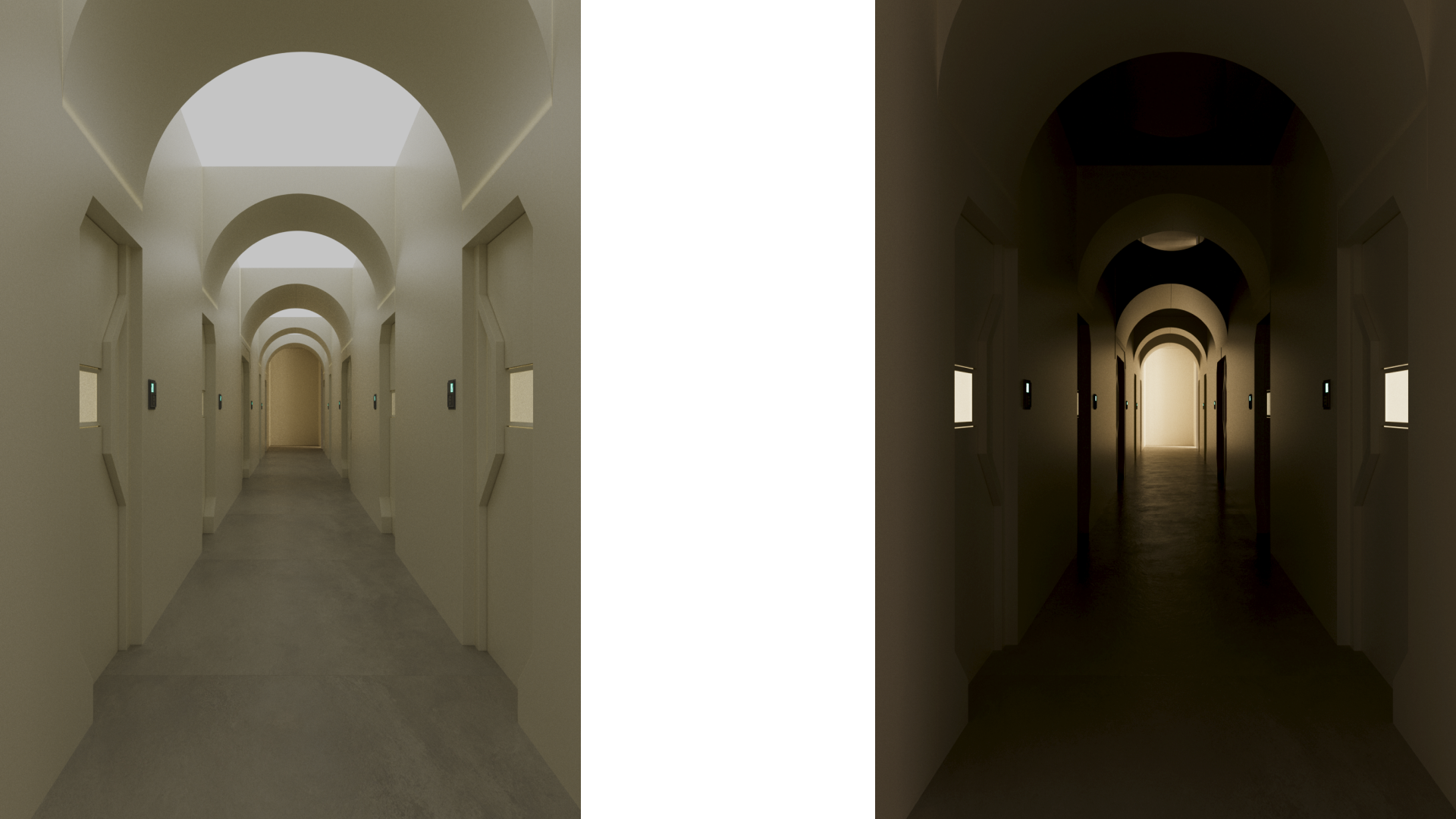 • Контраст Света и Тени: - Чередование светлых и темных зон, например, в длинных коридорах жилого корпуса или в «шлюзе», позволяет подчеркнуть архитектурные формы и создать ощущение переходного пространства.