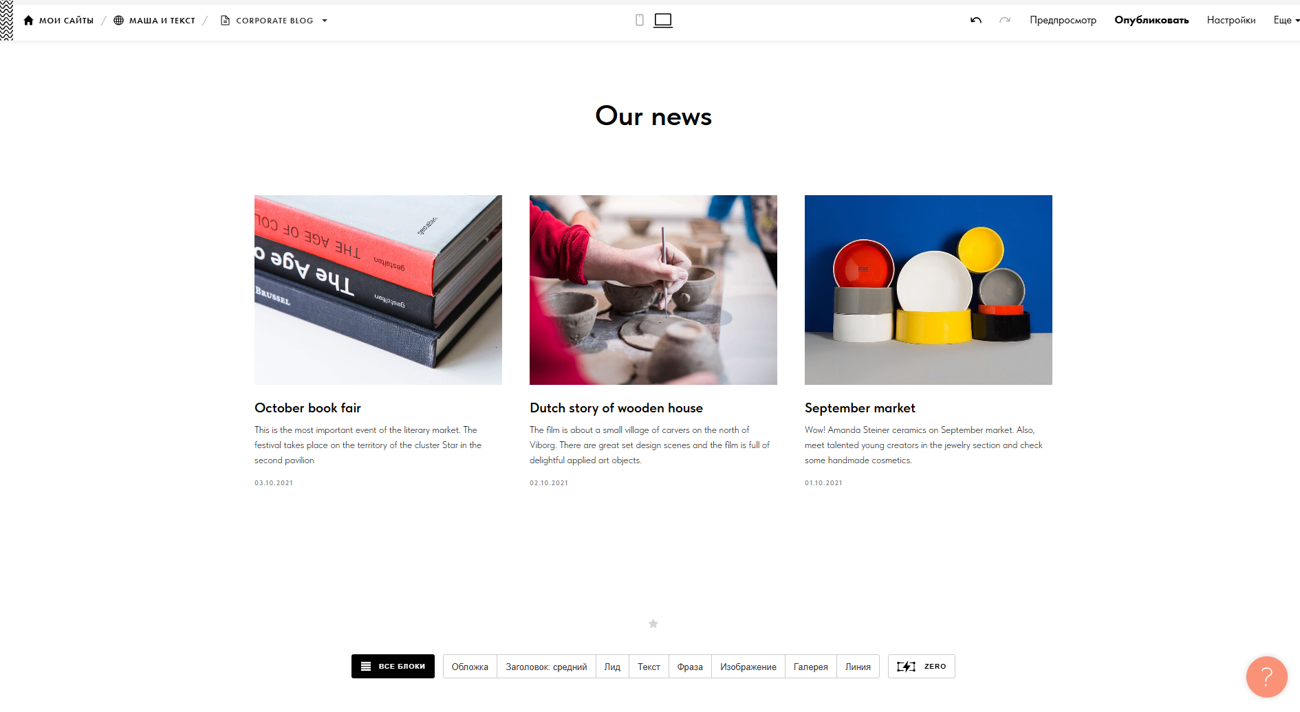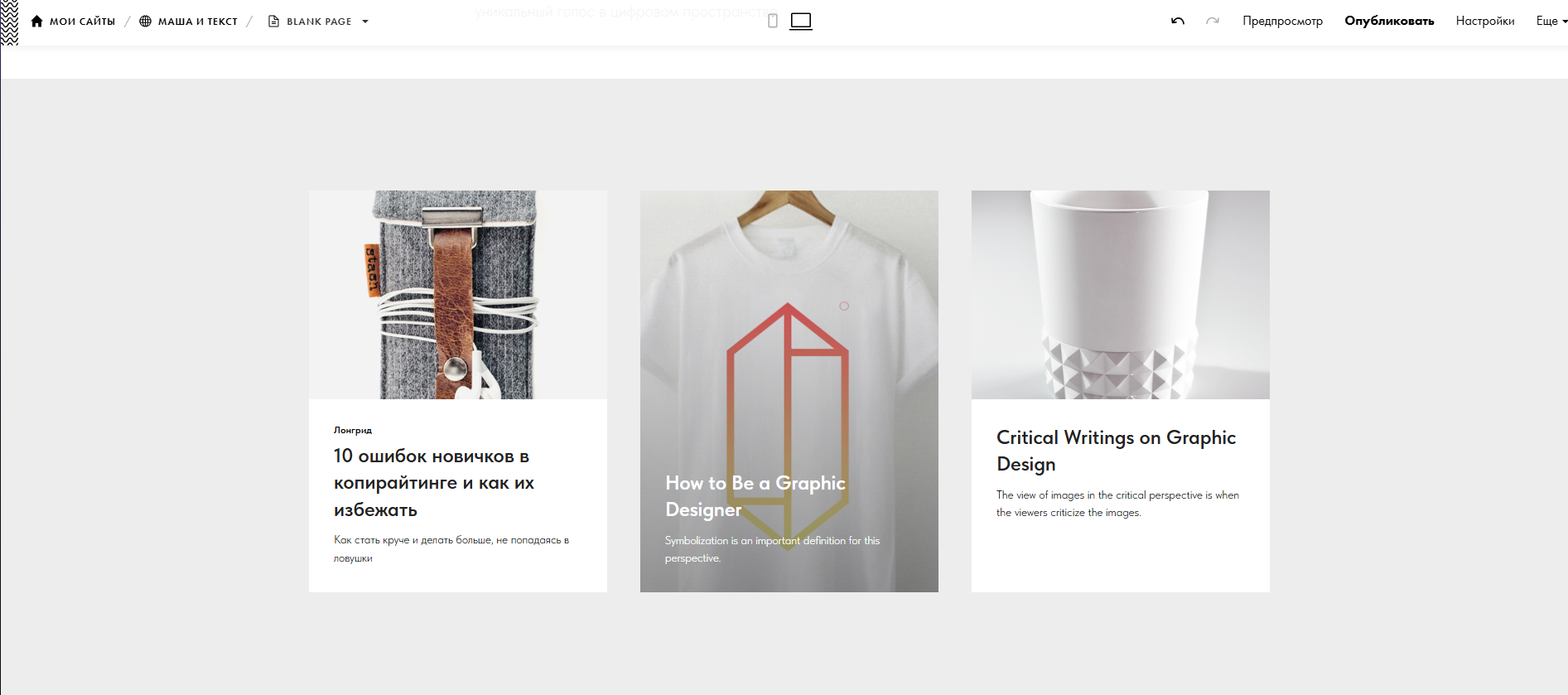 Добавьте другие статьи по тому же принципу. Если текст пока один, удалите лишние карточки. Проверьте, чтобы все корректно отображалось.