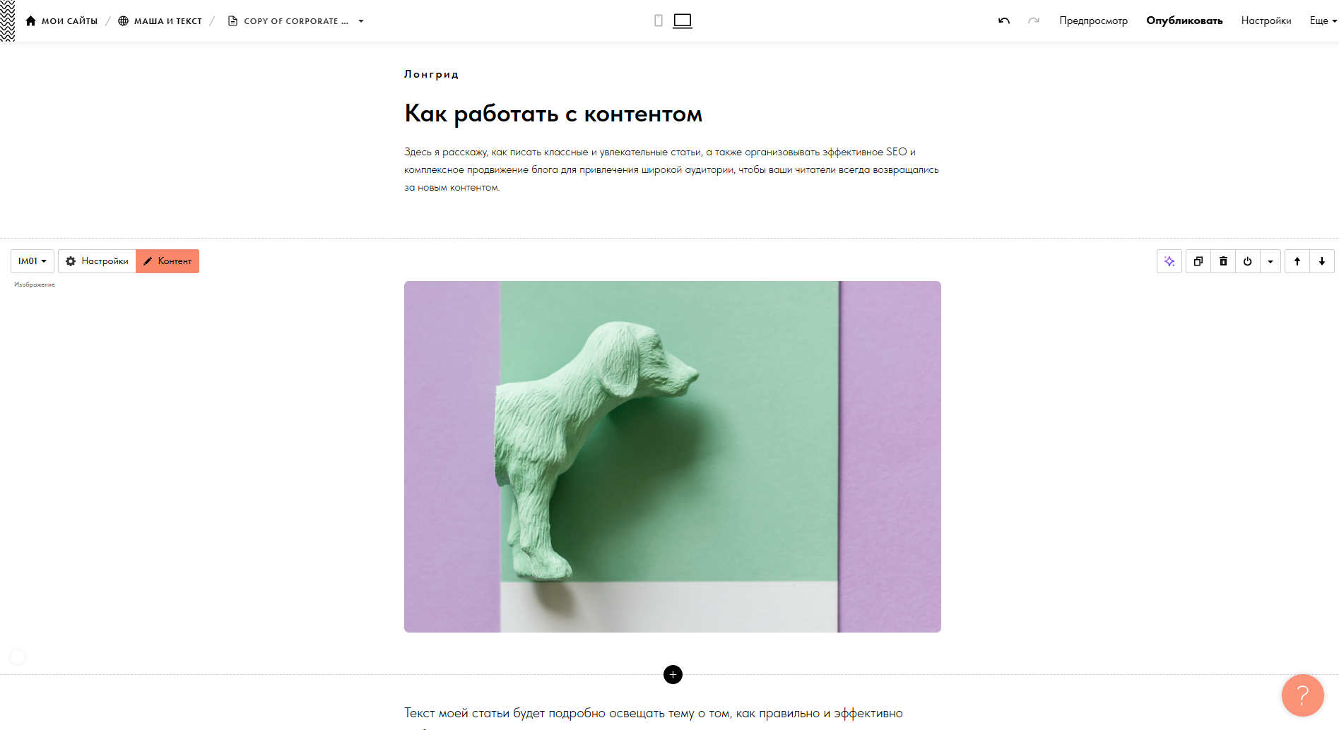 Чтобы создать статью на отдельной странице, но не оформлять с нуля шапку и подвал, зайдите на страницу блога и продублируйте ее. Как это сделать: «Настройки» в правом верхнем углу страницы → «Действия» → «Дублировать страницу» → «Перейти к новой странице».