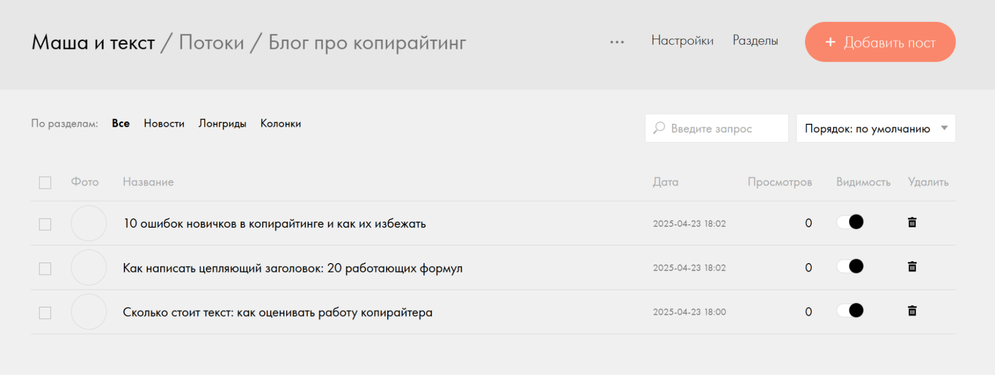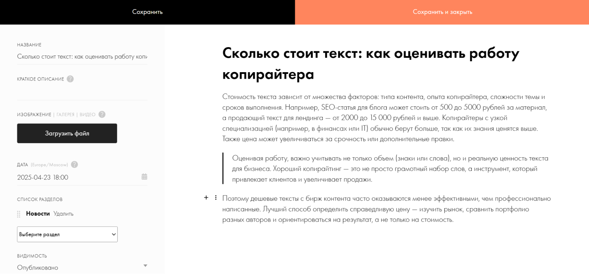Нажмите на кнопку «Добавить пост» и напишите заголовок будущей статьи. После этого откроется страница для ввода текста, а также меню, чтобы добавить обложку, указать раздел, к которому будет относиться материал, и установить дату и время публикации.