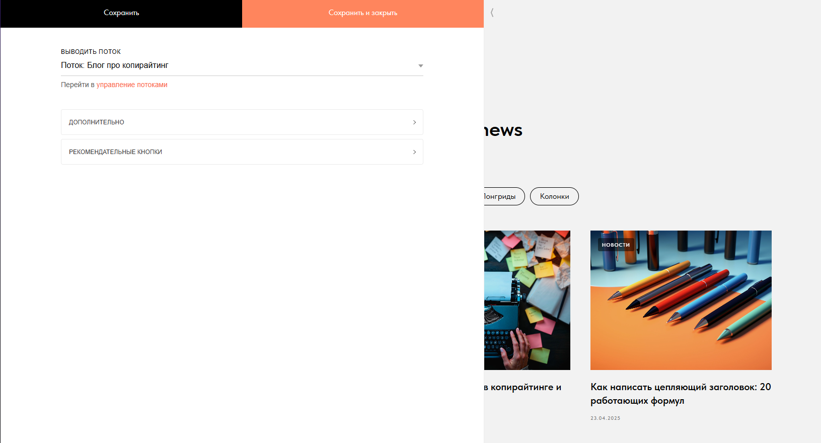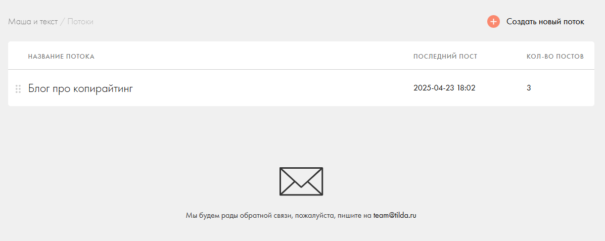 Потоки — инструмент для создания новостных лент с автообновлением. Чтобы разместить блок с потоком на странице блога, нажмите на кнопку «Все блоки» → «Новости и потоки» → «Поток: сетка для новостей или блога».