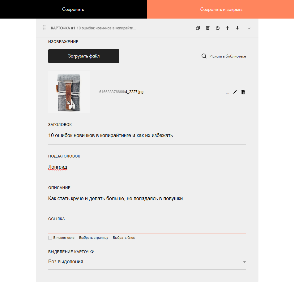 Добавив блок, нажмите на кнопку «Контент» внутри него. Откроется меню для редактирования содержимого. Общие название и подзаголовок можно удалить, а карточки отредактировать: заменить обложку, название и добавить ссылку на статью — ее можно не копировать, а выбрать сразу среди страниц всего сайта.