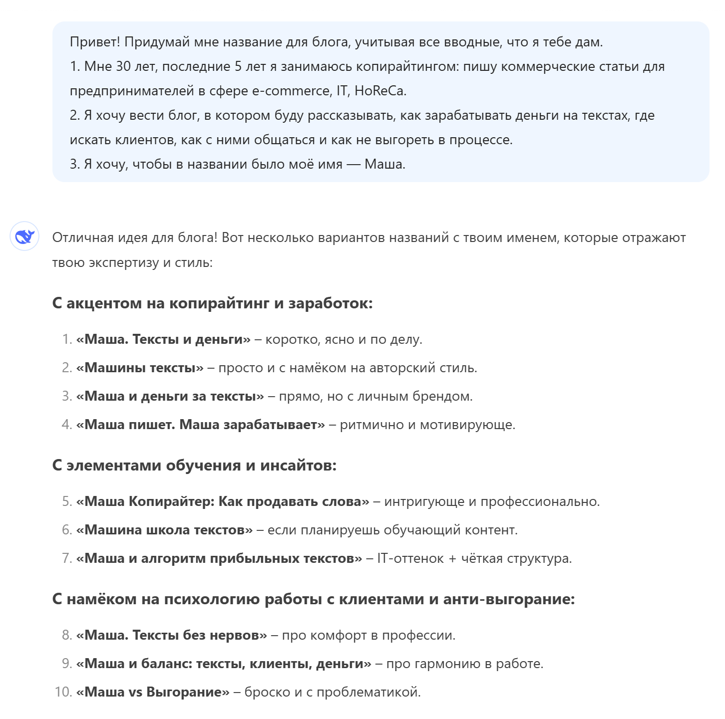 Вот такой промпт получился в DeepSeek. Чем подробнее вы расскажете нейросети о себе, тем конкретнее будут предложения