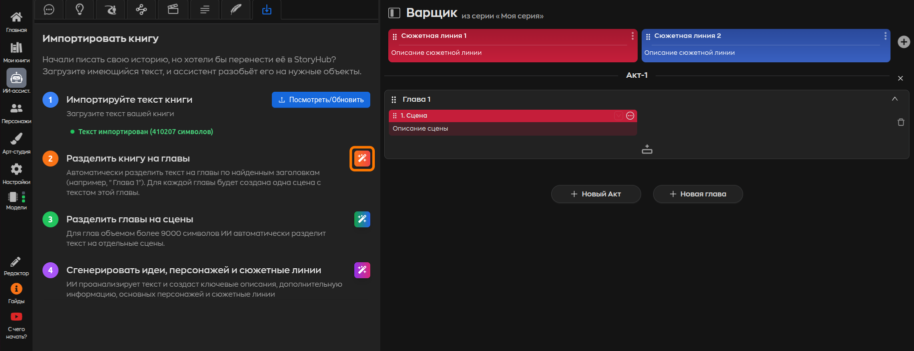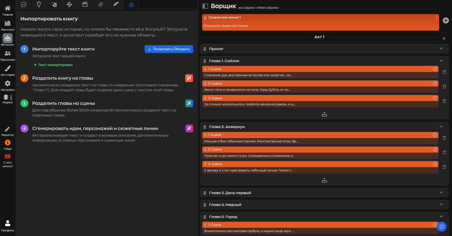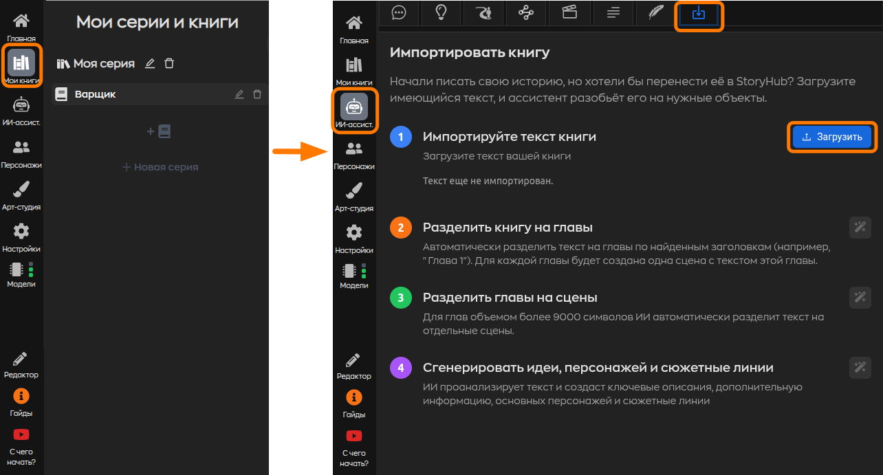 После того как мы зарегистрировались, нам нужно создать новую серию и книгу в разделе “Мои книги”. Можно сразу их переименовать. Затем перейти в раздел “ИИ-ассистент”, выбрать вкладку “Импорт” и нажать кнопку “Загрузить”.