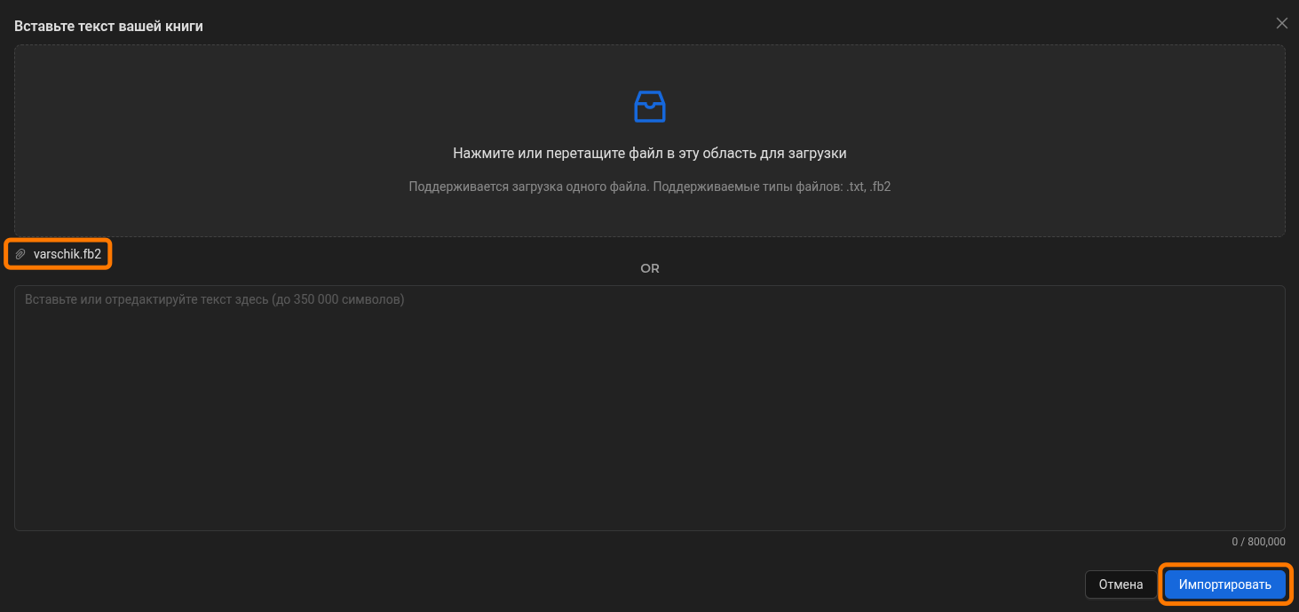 Далее выбираем файл с нашей историей и импортируем. На бесплатном тарифе можно загрузить текст объёмом до 150 000 символов - этого вполне достаточно, чтобы оценить возможности и немного поэкспериментировать.
