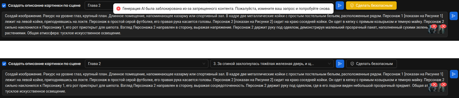 На такой случай рядом с кнопкой генерации описания есть кнопка “Сделать безопасным”. Этой кнопкой можно воспользоваться, если генерация была заблокирована из-за запрещенного контента. Ассистент заменит потенциально запрещённые слова или словосочетания и постарается сделать описание более зацензуренным, но при этом сохранить исходный смысл сцены.