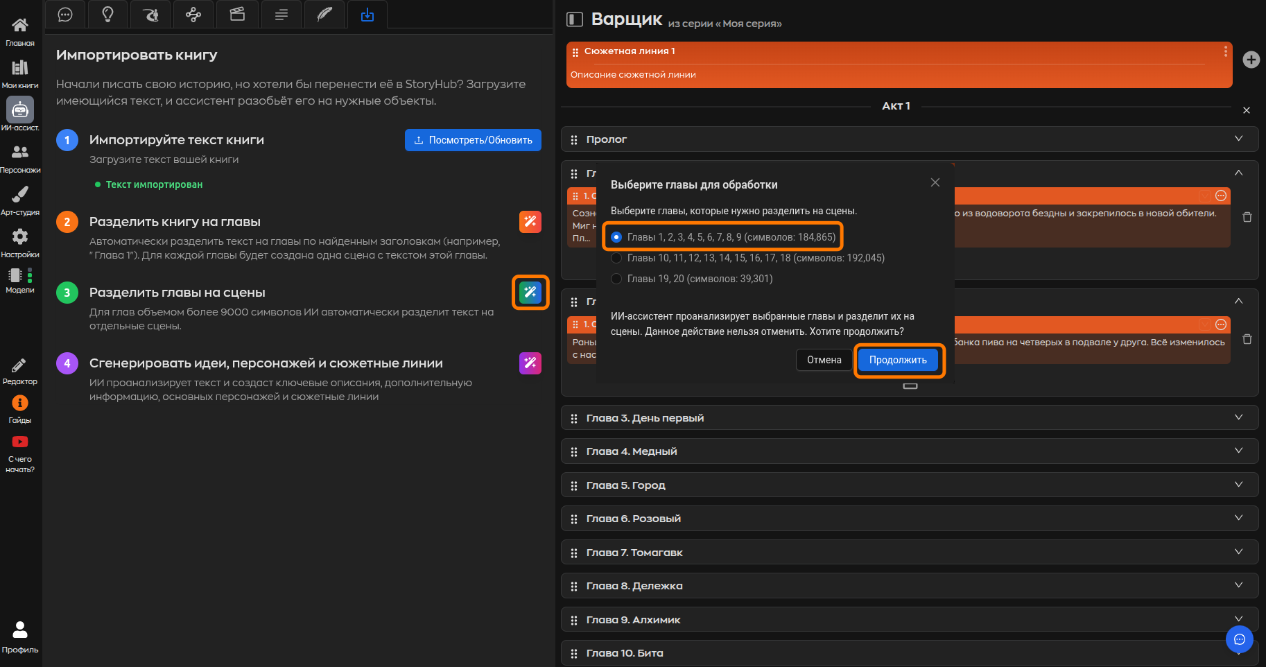 После нажатия кнопки “Разделить главы на сцены” мы увидим всплывающее окно. В нём нужно будет выбрать список глав, которые мы хотим разделить.