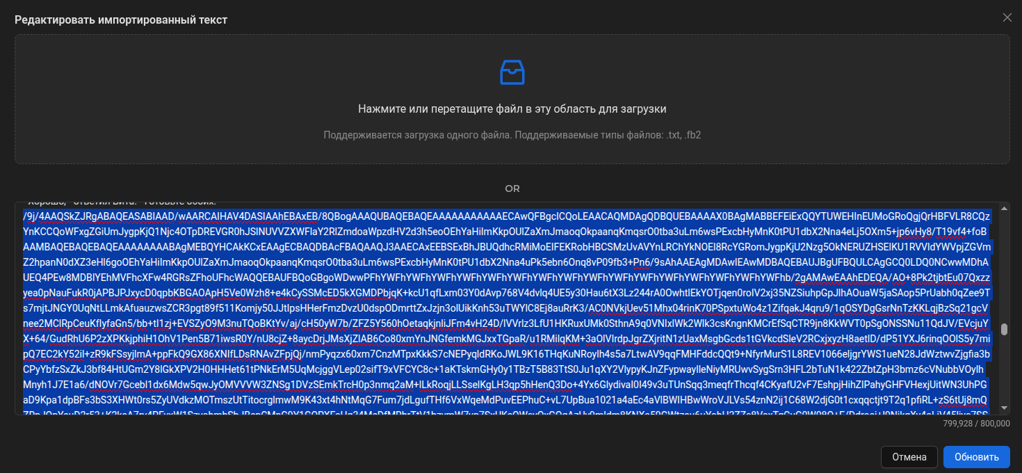 После того, как мы импортировали нашу работу, можно нажать кнопку “Посмотреть/Обновить”. Ниже в окне появится наш импортированный текст. Рекомендую хотя бы бегло просмотреть его и удалить лишнее. Например при выгрузке с АТ в формате fb2 я получил какой-то огромных хэш-код в конце текста. И перед тем как продолжить, я его удалил.