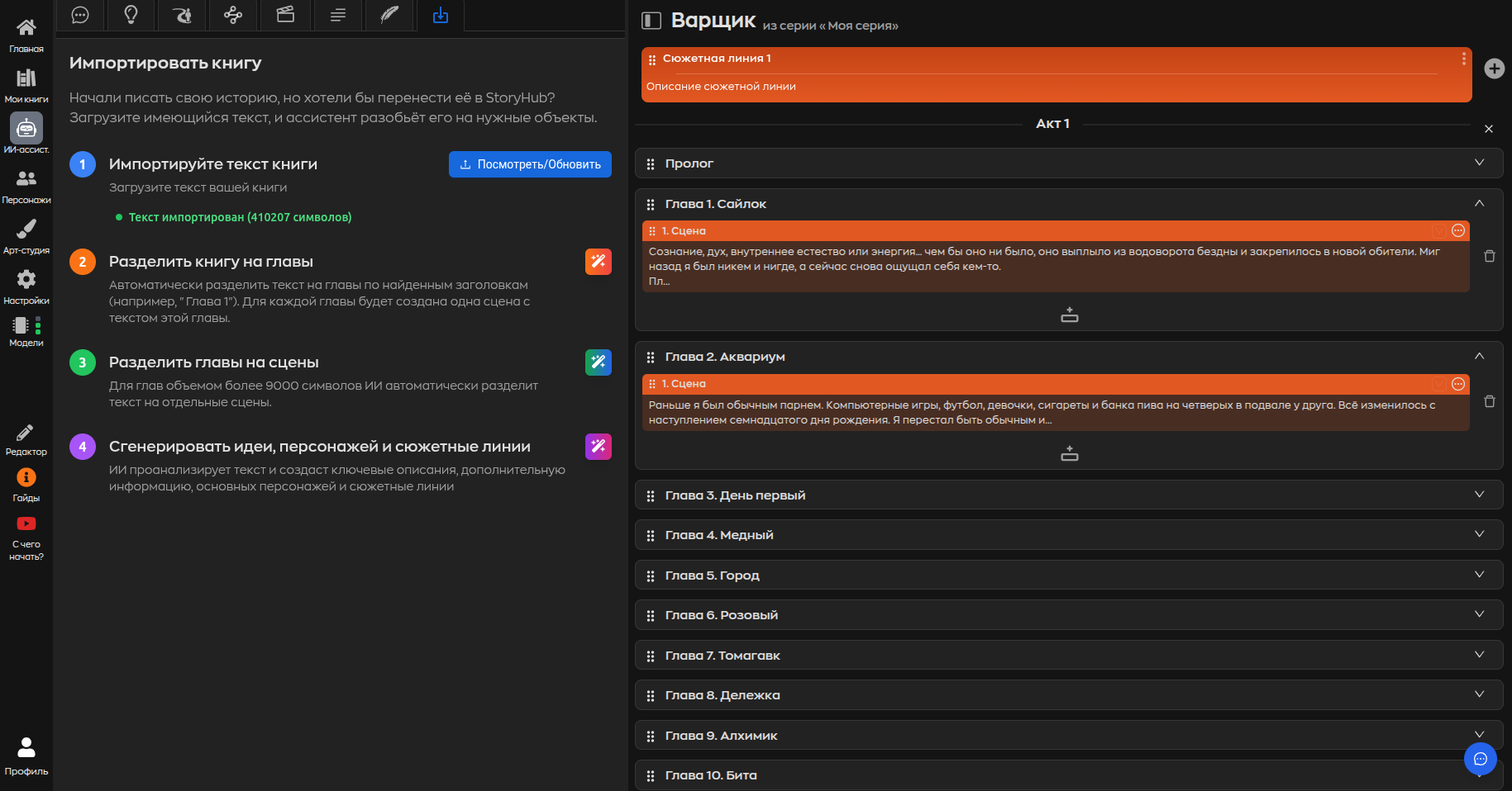 Проанализировав нашу историю, ИИ-ассистент создаст необходимые для контекста элементы истории, сюжетные линии и персонажей. По умолчанию все ранее созданные сцены будут относится к первой сюжетной линии - это нормально и для наших целей не имеет значения.