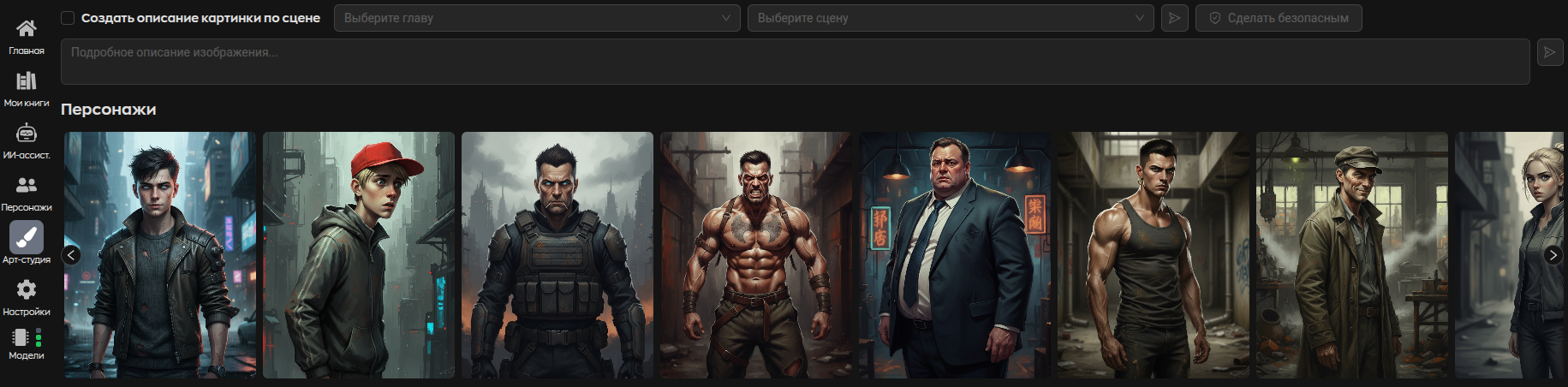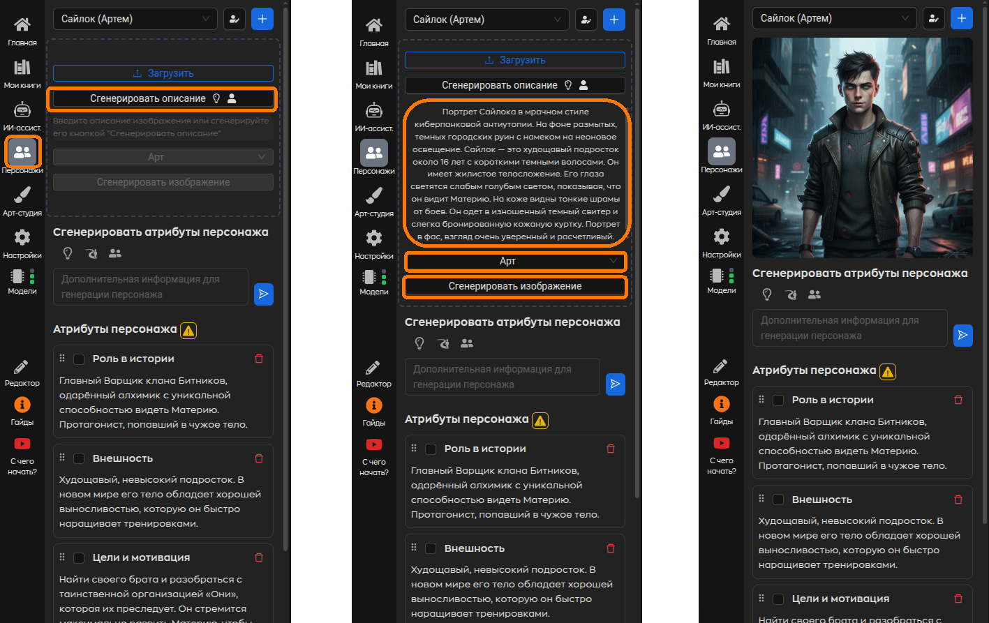 В разделе “Персонажи” выбираем персонажа и нажимаем кнопку “Сгенерировать описание”. По имеющемуся контексту и атрибутам персонажа ИИ-ассистент создаст вариант описания портрета. Затем мы можем выбрать стиль (в моём случае “Арт”) и нажать кнопку “Сгенерировать изображение”.