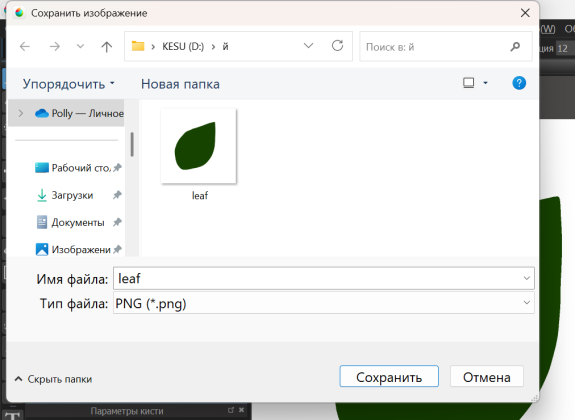 6. Чтобы сохранить вашу кисть для других, нужно найти листик, который мы нарисовали и сохранить в формате PNG с прозрачностью. И настройки вашей кисточки на отдельном скриншоте.