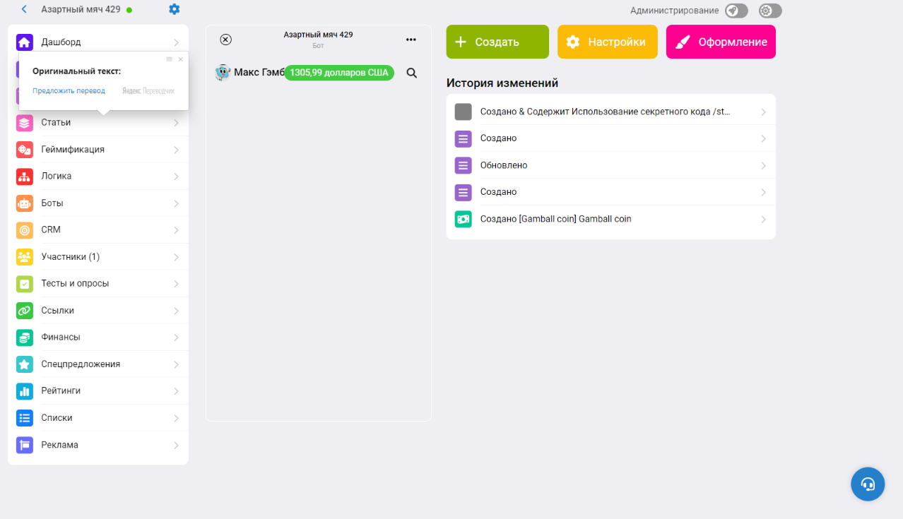 Нажимаем финансы создать валюту придумаваем валюту нажимаем. Геймификация создать игру тип кликер. Ставим иконку валюту которою мы создали и сохраняем нажимаем создать пункт меню. Категория список сохраняем. переходим в бота нажимаем на сделаный пункт и тапаем вот результат