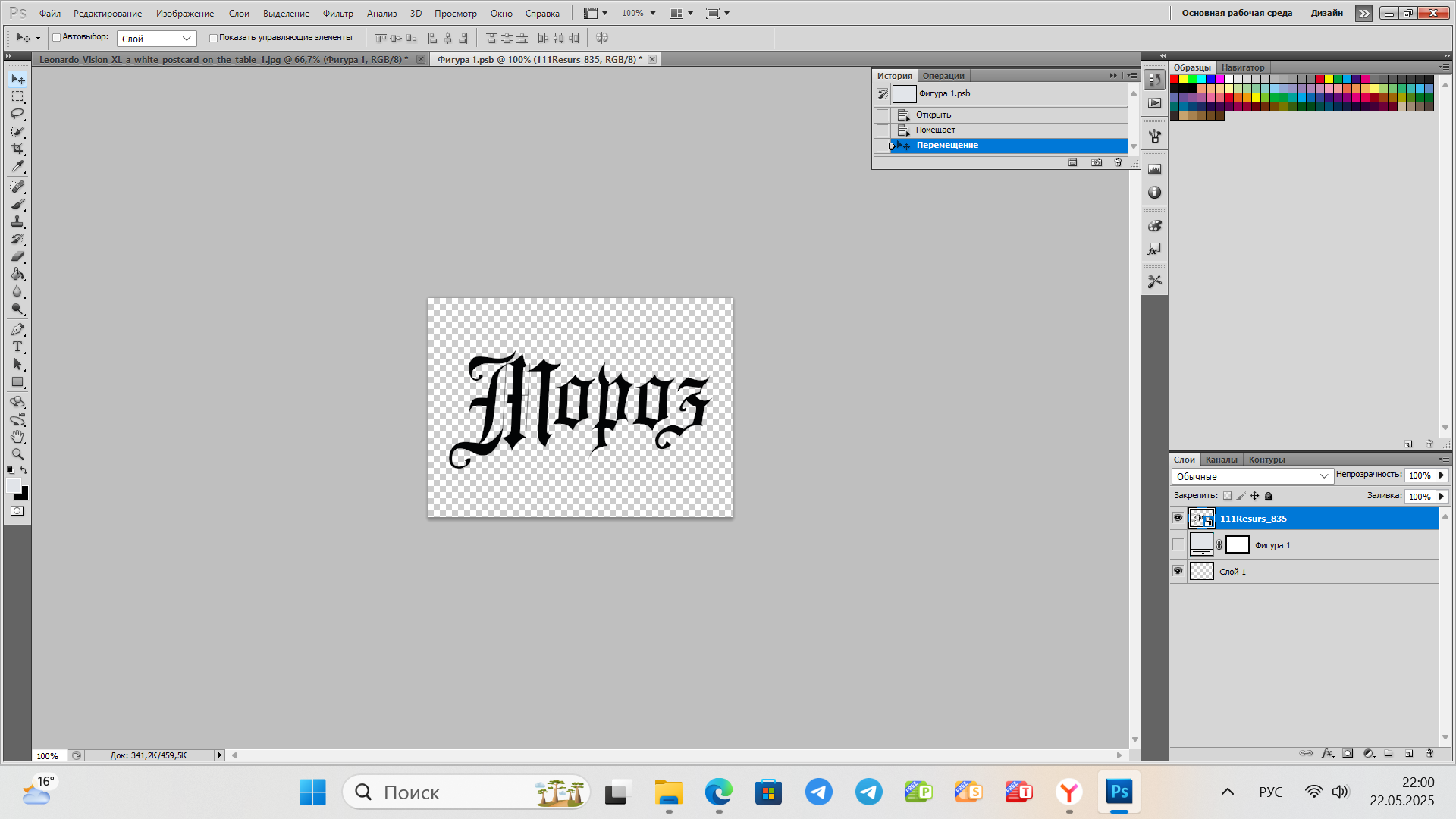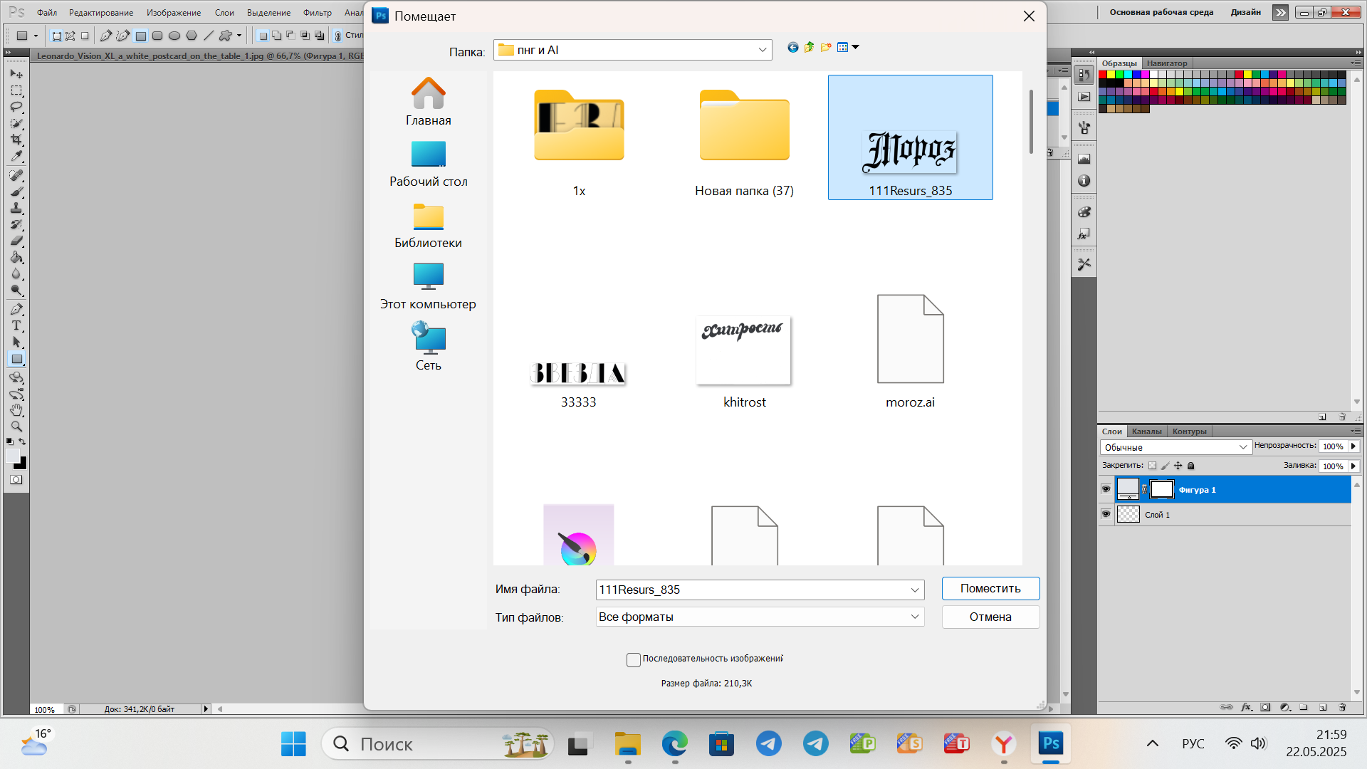 С помощью Файл - Поместить вставляем дизайн. Я выбрала что-то из старых своих леттеринг-работ формата PNG без фона.