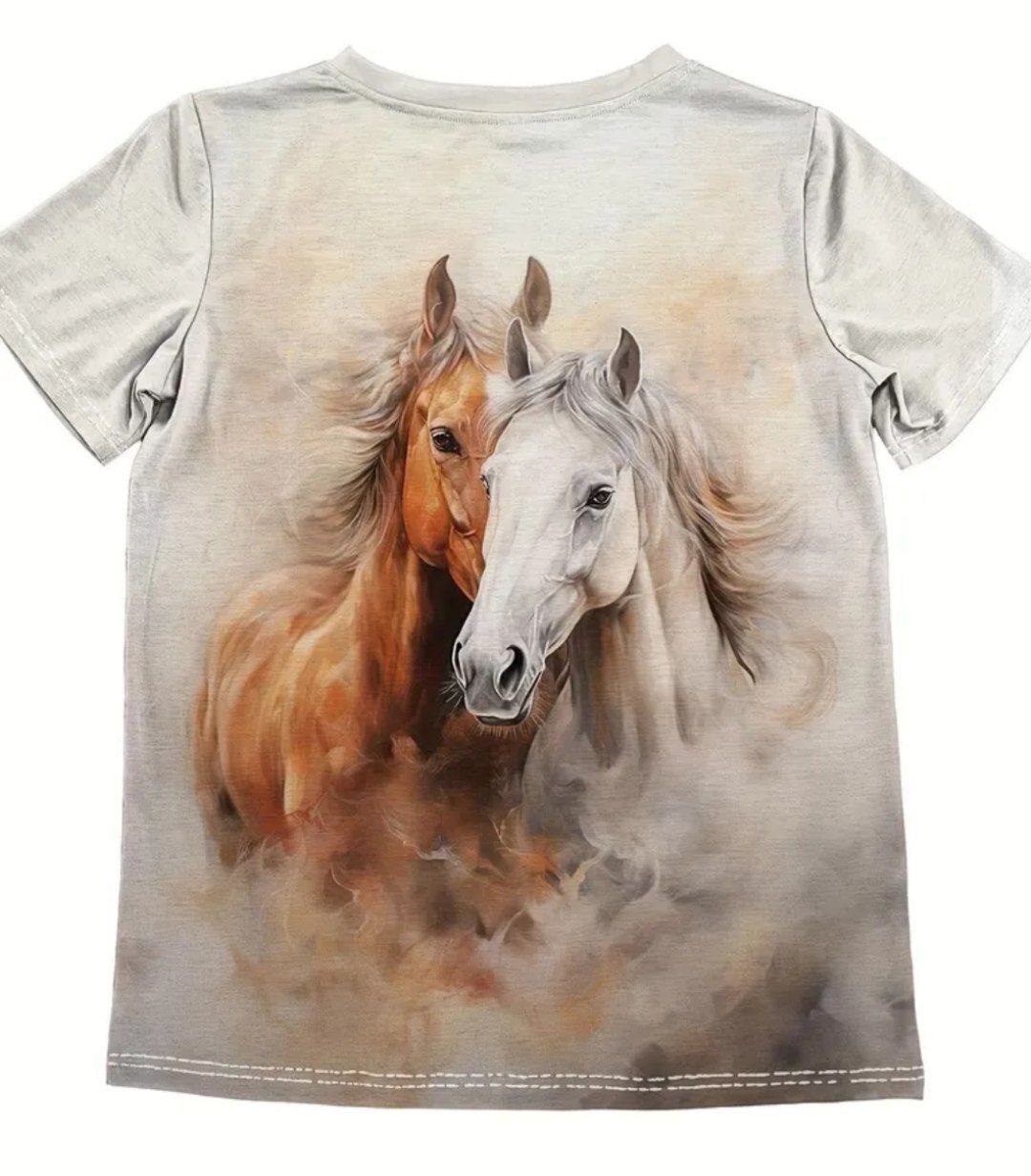 Девушка в футболке с принтом лошадей сидит верхом на лошади на фоне заката. Принт усиливает ощущение единения с природой. Ключевой объект - лошадь. Камера 50 мм, большая ГРИП, фокус на модели и лошади. Вертикальный кадр 3:4, фотореализм, теплый свет заката.