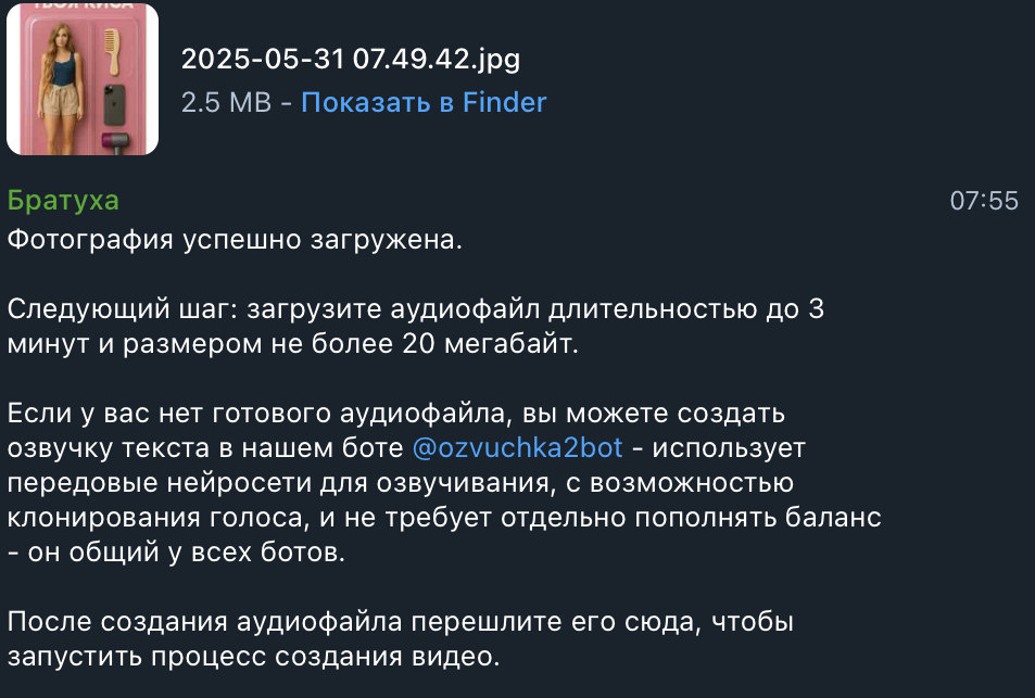 Шаг 8. Загружаем аудиофайл с голосом. Это может быть как простое голосовое сообщение, так и аудиофайл с озвучкой нужного текста. Озвучку вы можете сделать в нашем боте @ozvuchka2bot без необходимости отдельно пополнять баланс и с возможностью клонировать свой голос.