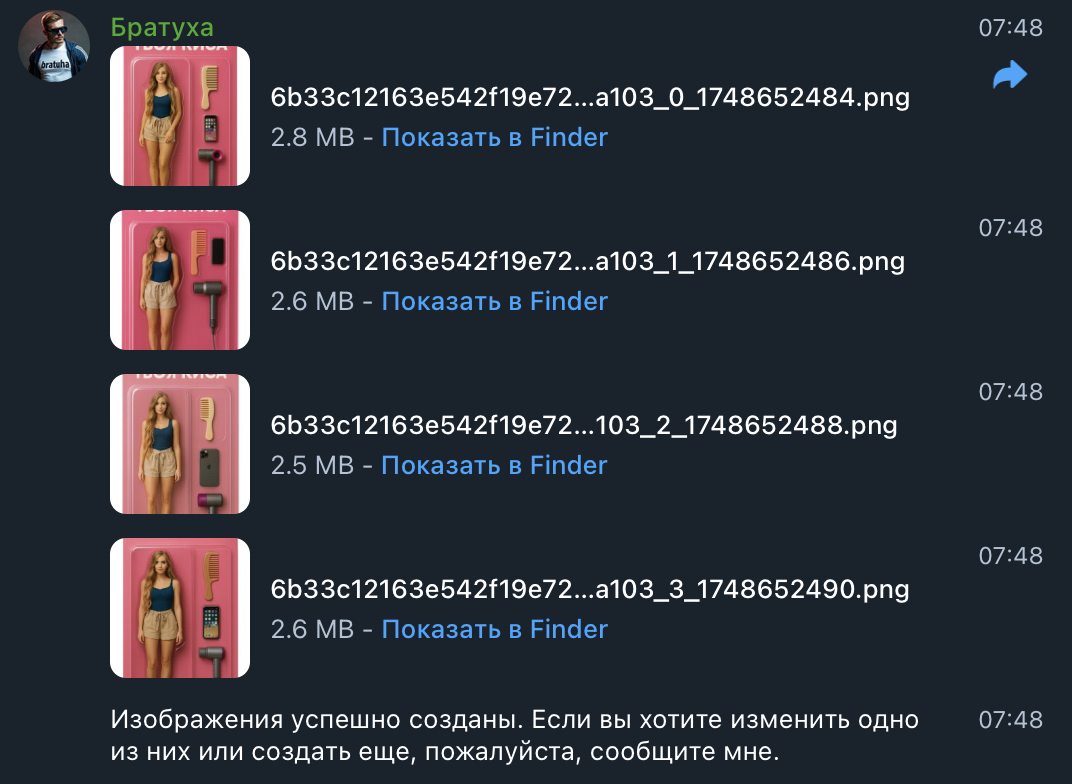 Шаг 5. Ждём примерно 2 минуты и получаем результаты, сразу 4 изображения. При необходимости напишите боту сообщение с описанием, как нужно изменить данную фигурку. Он в режиме диалога будет изменять ваше изображение пока вы не получите то, что хотите. Каждое выполнение задания и отправка вам изображений, вне зависимости от их количества, будет списывать с вашего счета 6 рублей. А вот какой получился результат: