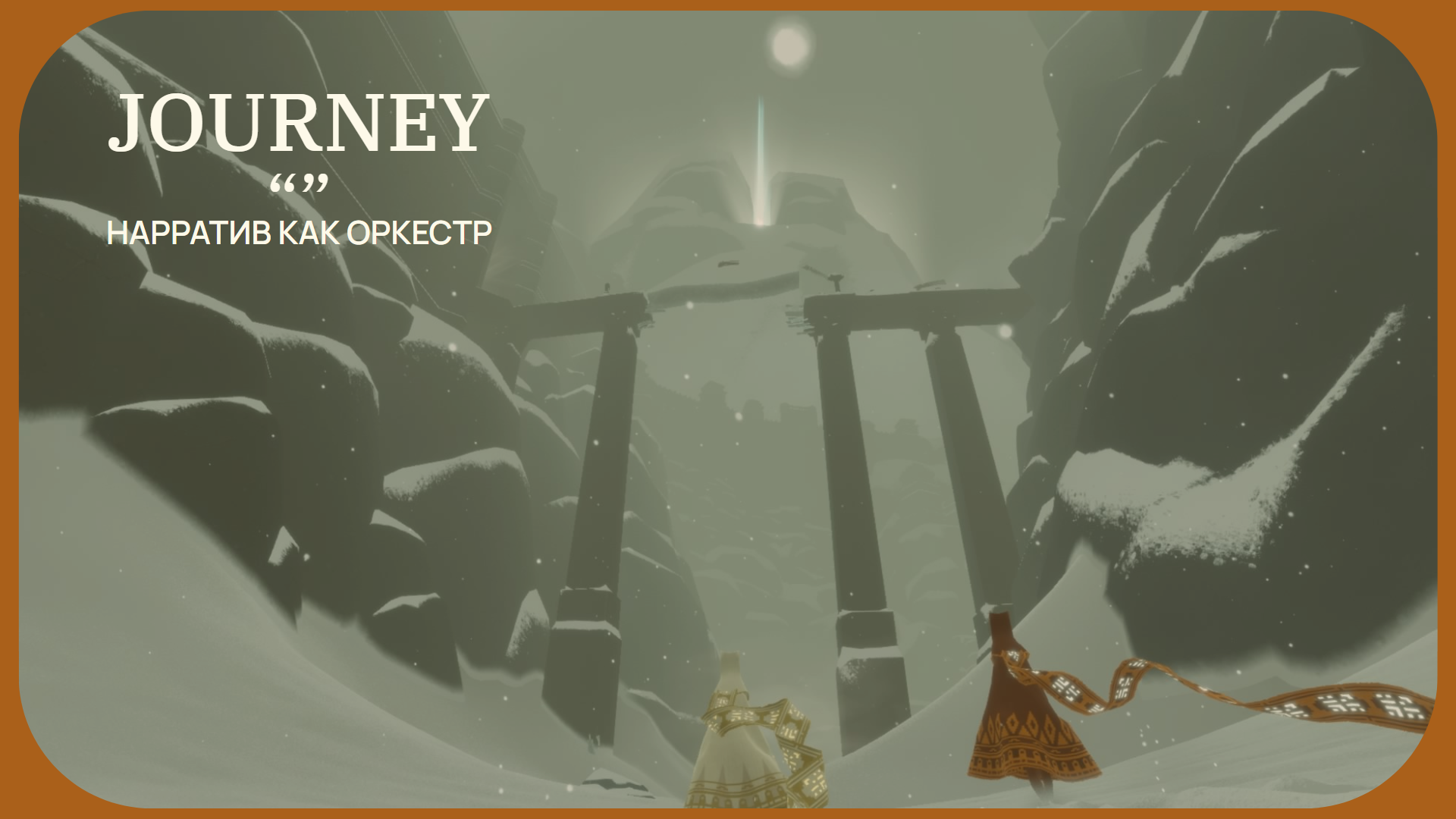 Например, звук в Journey не требует слов — он ведёт. Вместе с другими аспектами игры - визуальными эффектами, левел-дизайном, цветовой гаммой, механиками игрока, анимацией героя. Всё вместе работает так, будто тебя кто-то бережно держит за руку и ведёт, хотя рядом никого нет.
