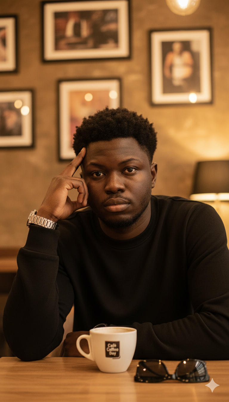 "A stylish young man using the attached photo sitting at a café table with a thoughtful expression, resting his hand on his temple. He has neatly styled voluminous hair, a trimmed beard, and wears a black sweatshirt with a wristwatch. In front of him on the table is a white coffee mug with the 'Café Coffee Day' logo and a pair of black sunglasses. The background features warm-toned walls, framed artwork, and soft blurred lighting, creating a cozy indoor café atmosphere. Ultra-realistic portrait photography, sharp focus on the subject, smooth skin tone, and cinematic color grading."