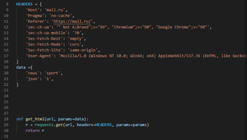 Далее передаём вышеописанное в сам код (HEADERS = request headers, data = query string parameters)